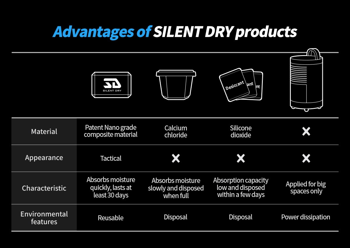 | ΧΑΡΑΚΤΗΡΙΣΤΙΚΑ | Απορροφά την υγρασία γρήγορα, διαρκεί τουλάχιστον για 30 ημέρες | Απορροφά την υγρασία αργά και όταν γεμίσει απορρίπτεται στα σκουπίδια. | Η ικανότητα απορρόφησης είναι χαμηλή και απορρίπτεται στα σκουπίδια μετά από μερικές μέρες χρήσης | Είναι κατάλληλος μόνο για μεγάλους χώρους |