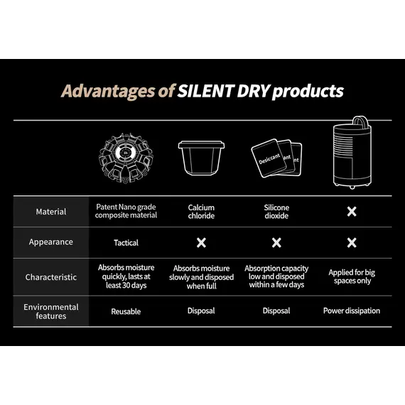 | ΧΑΡΑΚΤΗΡΙΣΤΙΚΑ | Απορροφά την υγρασία γρήγορα, διαρκεί τουλάχιστον για 30 ημέρες | Απορροφά την υγρασία αργά και όταν γεμίσει απορρίπτεται στα σκουπίδια. | Η ικανότητα απορρόφησης είναι χαμηλή και απορρίπτεται στα σκουπίδια μετά από μερικές μέρες χρήσης | Είναι κατάλληλος μόνο για μεγάλους χώρους |