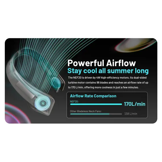 Το NEF20 κινείται από κινητήρες υψηλής απόδοσης 4W. Ο κινητήρας τουρμπίνας διπλής όψης περιέχει 96 πτερύγια και φτάνει σε ρυθμό ροής αέρα έως και 170 L/min, προσφέροντας περισσότερη δροσιά σε λίγα μόλις λεπτά.