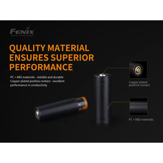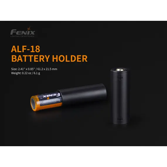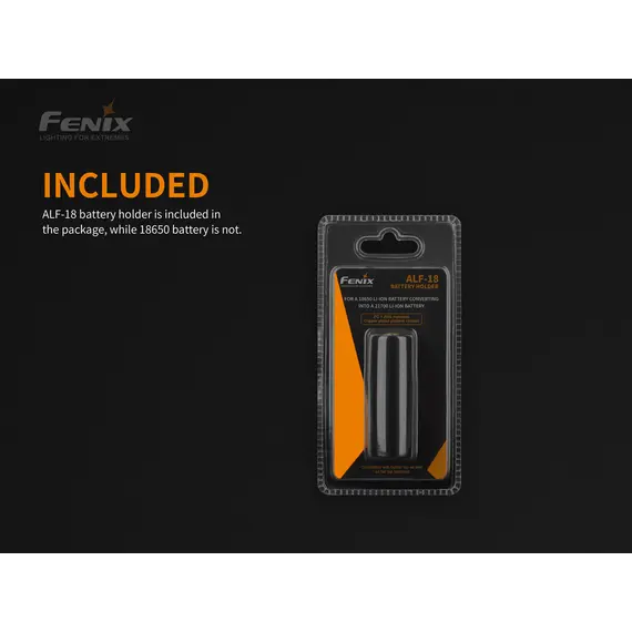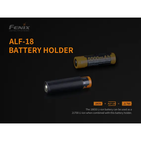 Ο Αντάπτορας μπαταρίας Fenix ALF-18 σάς επιτρέπει να χρησιμοποιείτε μια μπαταρία 18650 σε φακούς που είναι κατασκευασμένοι για να χρησιμοποιούν μπαταρία 21700. Απλώς τοποθετήστε την μπαταρία 18650 στη θήκη και τοποθετήστε και τις δύο στον φακό που λειτουργεί με μπαταρία 21700. Κατασκευασμένο με επαφές χαλκού παρέχει εξαιρετική απόδοση αγωγιμότητας. Συμβατό με μπαταρίες flat top 18650.