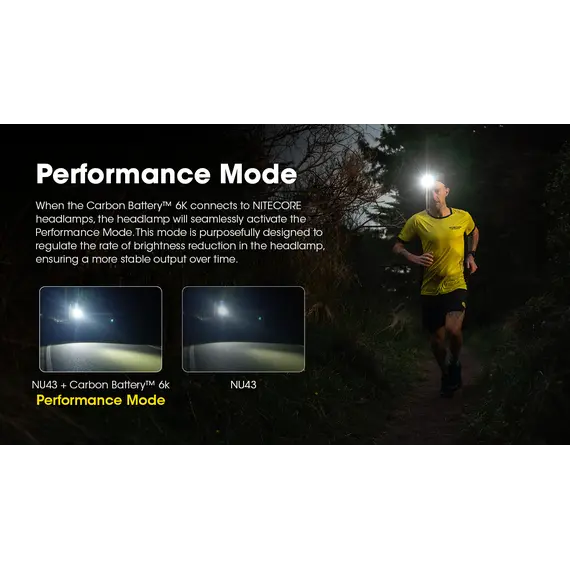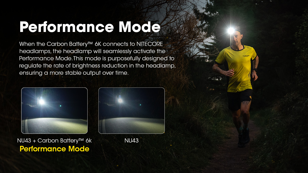 Όταν το Carbon Battery™ 6K συνδεθεί με έναν φακό κεφαλής NITECORE, ο φακός κεφαλής ενεργοποιεί άμεσα την λειτουργία επιδόσεων.