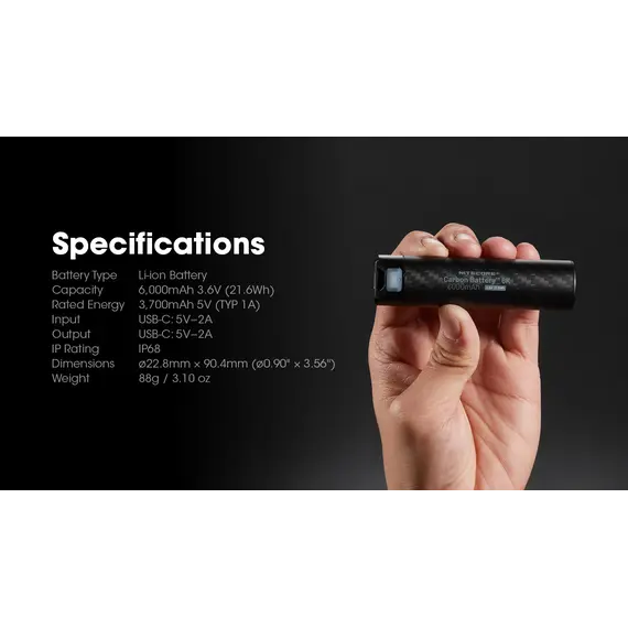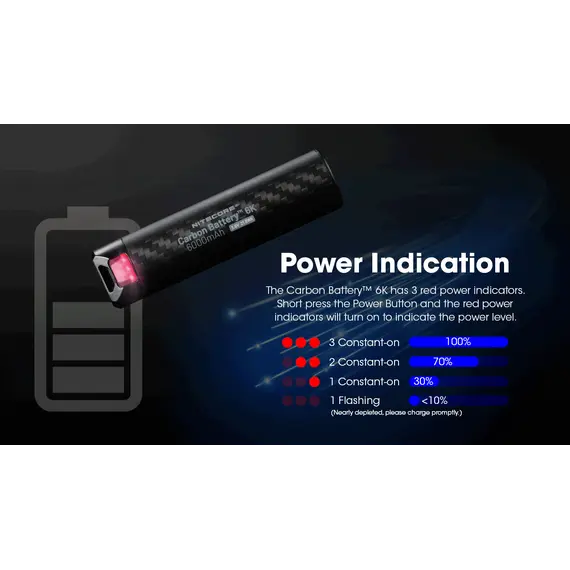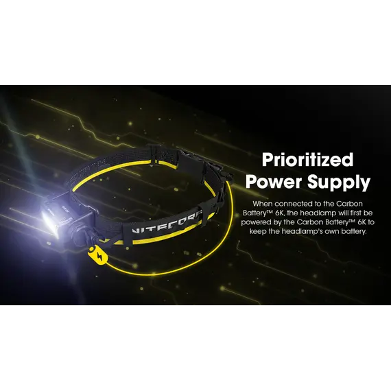 Όταν ο φακός κεφαλής συνδεθεί με το Carbon Battery™ 6K θα τροφοδοτηθεί πρώτα από το Carbon Battery™ 6K έτσι ώστε να διατηρηθεί η ενσωματωμένη μπαταρία του φακού.