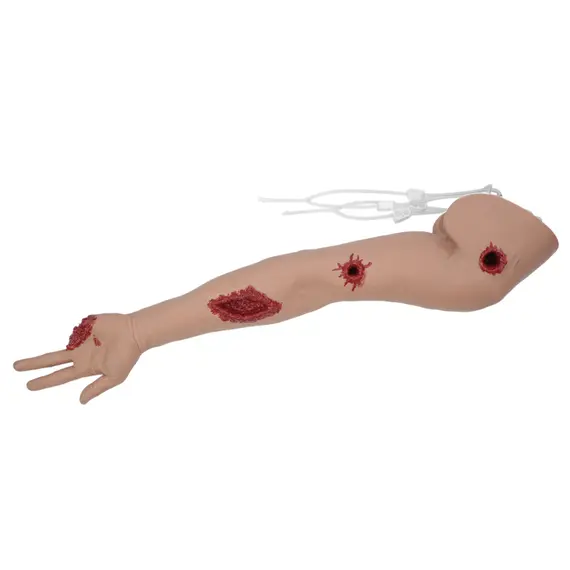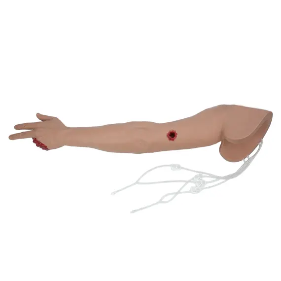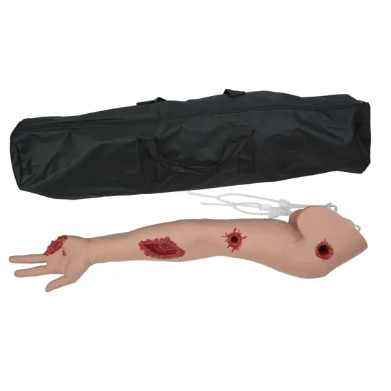 Το συγκεκριμένο εκπαιδευτικό ομοίωμα είναι μια προσιτή και πρακτική λύση ρεαλιστικής εκπαίδευσης για τον έλεγχο της αιμορραγίας και τη διαχείριση τραυματικών πληγών ενός χεριού. Είναι ιδανικό για την οικοδόμηση της αυτοπεποίθησης των ασκούμενων στη χρήση ιμάντα ίσχαιμης περίδεσης (tourniquet) και την εξοικείωση με τις τεχνικές εφαρμογής αιμοστατικών επιδέσμων, γαζών κλπ. Το εκπαιδευτικό ομοίωμα τραυμάτων χεριού έρχεται με τέσσερα (4) διαφορετικά είδη τραυμάτων: