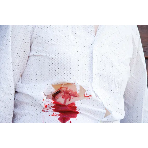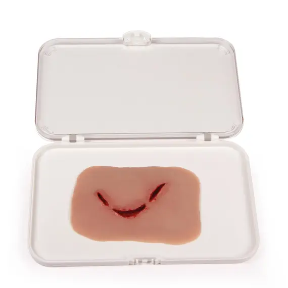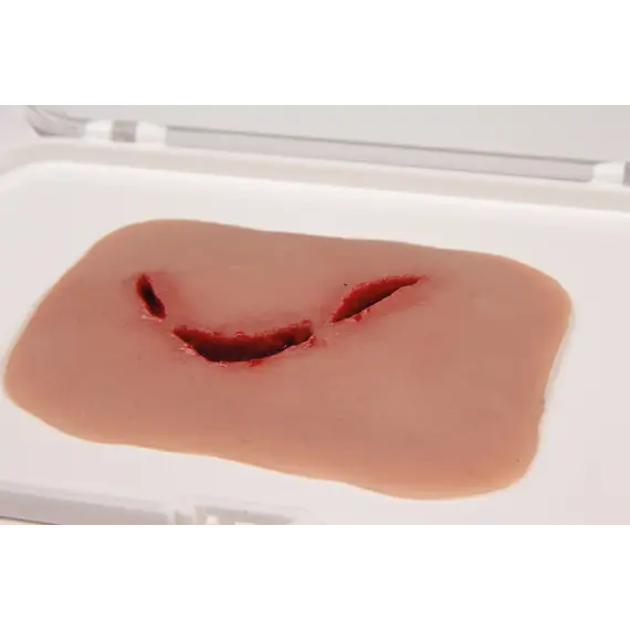 Αυτό το ομοίωμα δείχνει ένα τραύμα από σπασμένο μπουκάλι. Το ομοίωμα προσκολλάται σε δέρμα ή σε πρόπλασμα. Διατίθεται προαιρετική κόλλα δέρματος για περισσότερη εξάσκηση ή βελτιωμένη πρόσφυση.