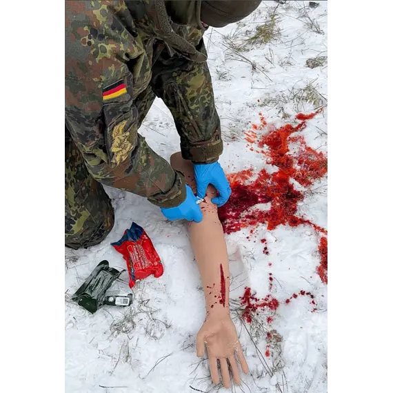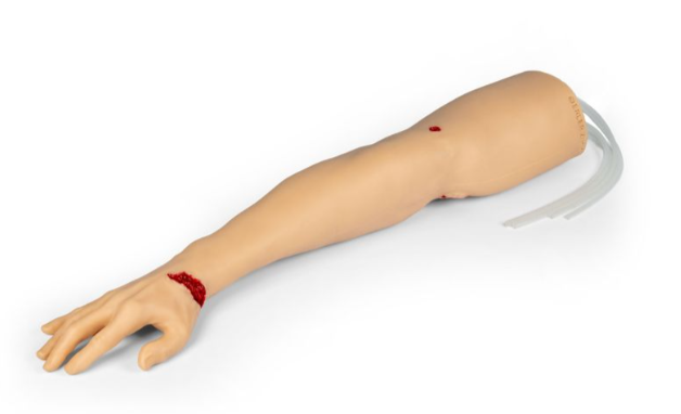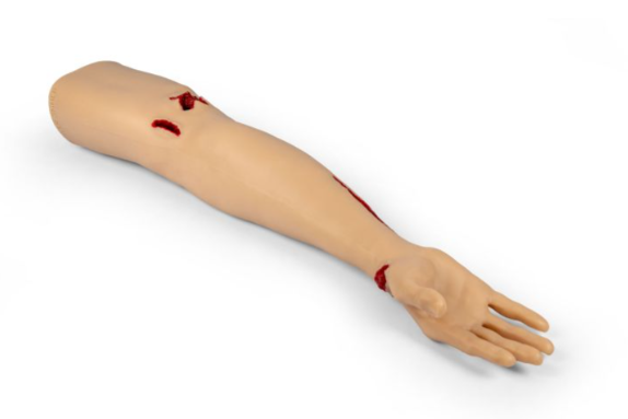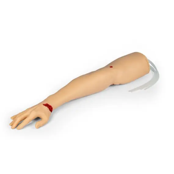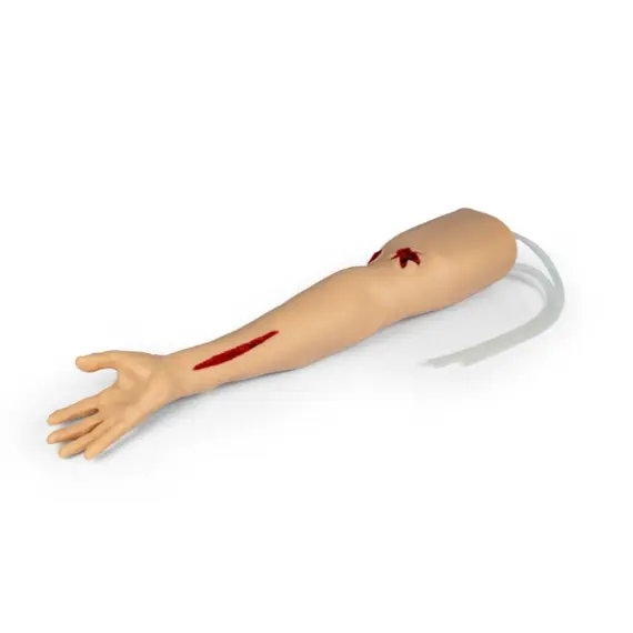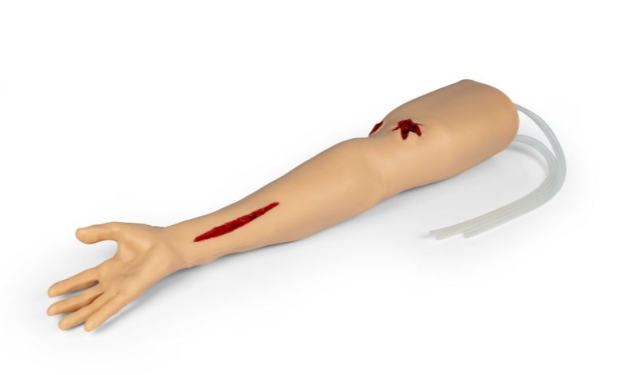 Αναπαριστά αναλυτικά το άνω άκρο - από τα δάχτυλα έως τον άνω βραχίονα - με ανατομικά ακριβή θέση αγγείων και χειροποίητες πληγές, προσφέροντας προσομοίωση πέντε λειτουργικών αρτηριακών αιμορραγιών: