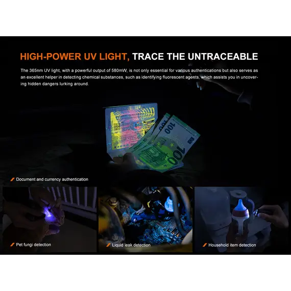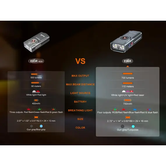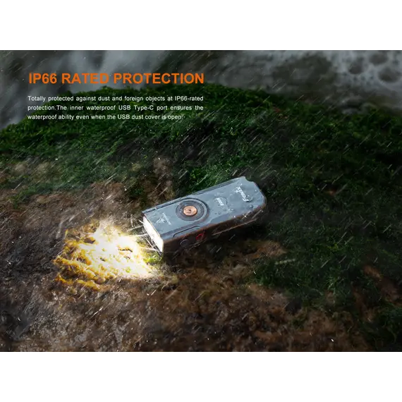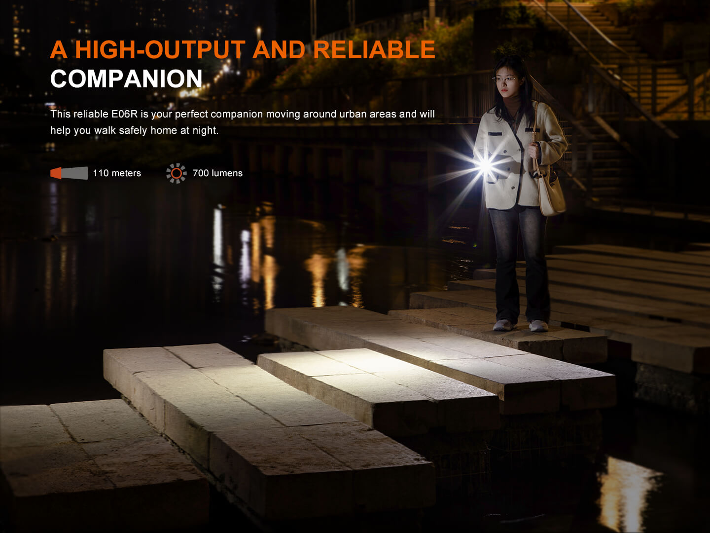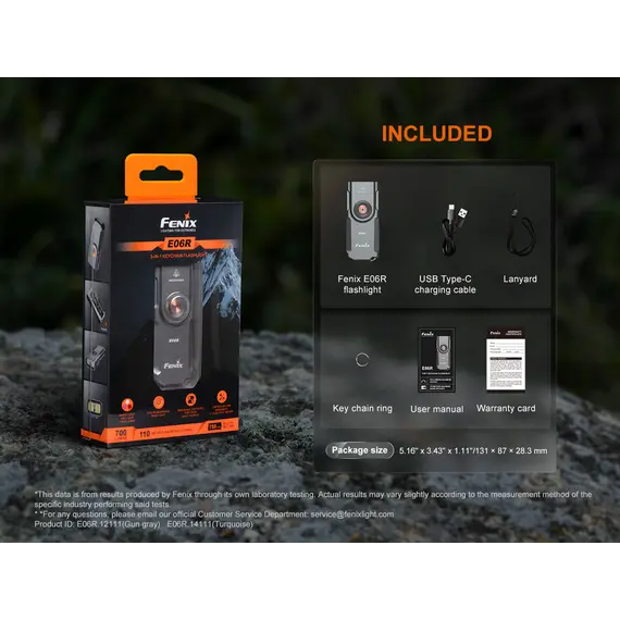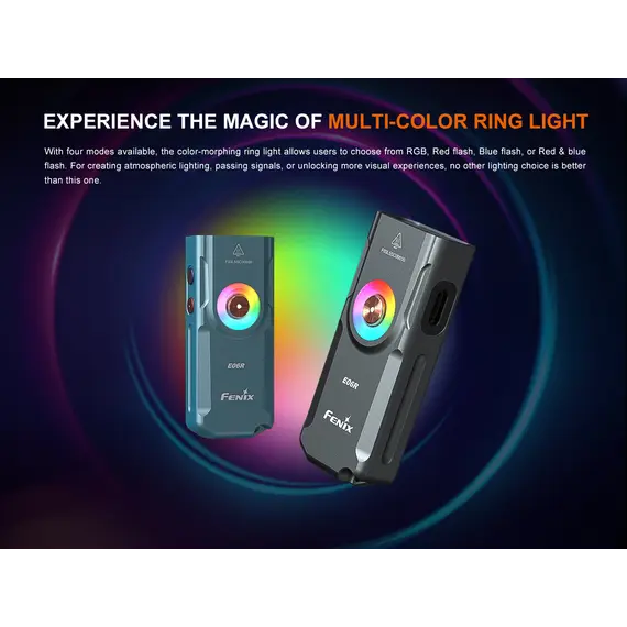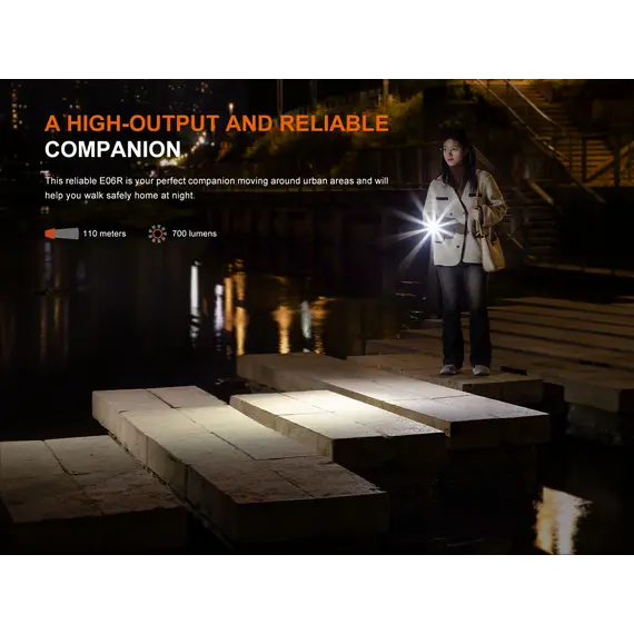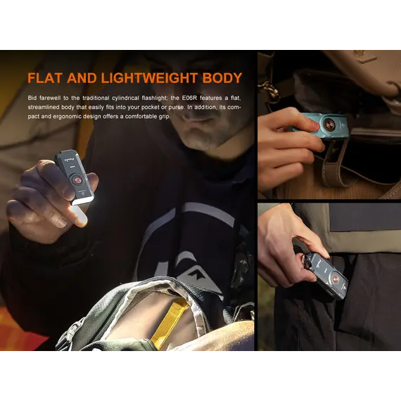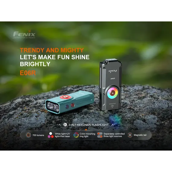 Φακός Fenix E06R Επαναφορτιζόμενος Με USB O Φακός Fenix E06R Παρότι είναι συμπαγείς - έχει εντυπωσιακή απόδοση 700 lumens και ακτίνα 110 μέτρων. Διαθέτει 10 λειτουργίες φωτισμού, συμπεριλαμβανομένων τεσσάρων επιπέδων φωτεινότητας, υπεριώδους ακτινοβολίας, κόκκινου δείκτη λέιζερ και τεσσάρων διακοσμητικών λειτουργιών δακτυλίου, αυτός ο μικρός φακός EDC είναι τόσο πρακτικός όσο και ισχυρός. Ο Φακός Fenix E06R είναι εξοπλισμένος με ενσωματωμένη μπαταρία 750 mAh, διαθέτει μαγνητική ουρά για χρήση χωρίς χέρια, διακοσμητικό ring light, βρόχο μπρελόκ και λειτουργία κλειδώματος/ξεκλειδώματος για την αποφυγή τυχαίας ενεργοποίησης. Ανθεκτικό και γεμάτο χαρακτηριστικά, ο E06R έχει τέλειο μέγεθος για καθημερινή μεταφορά ή ως αξιόπιστη προσθήκη στον εξοπλισμό σας.