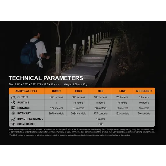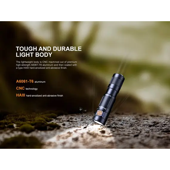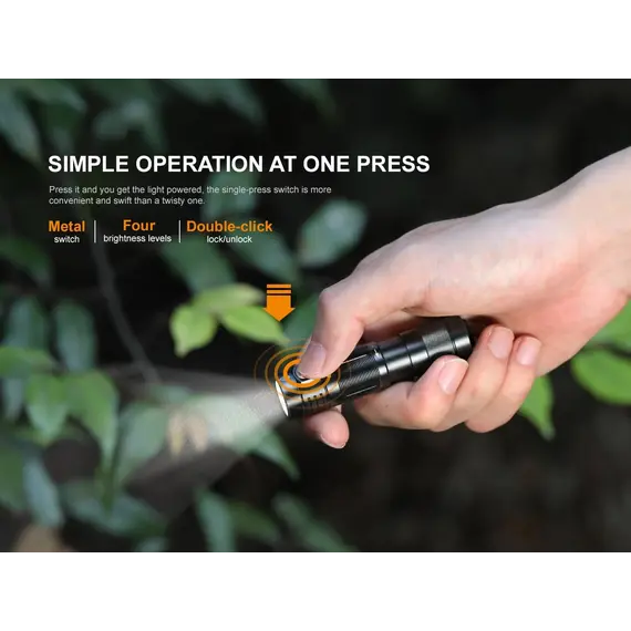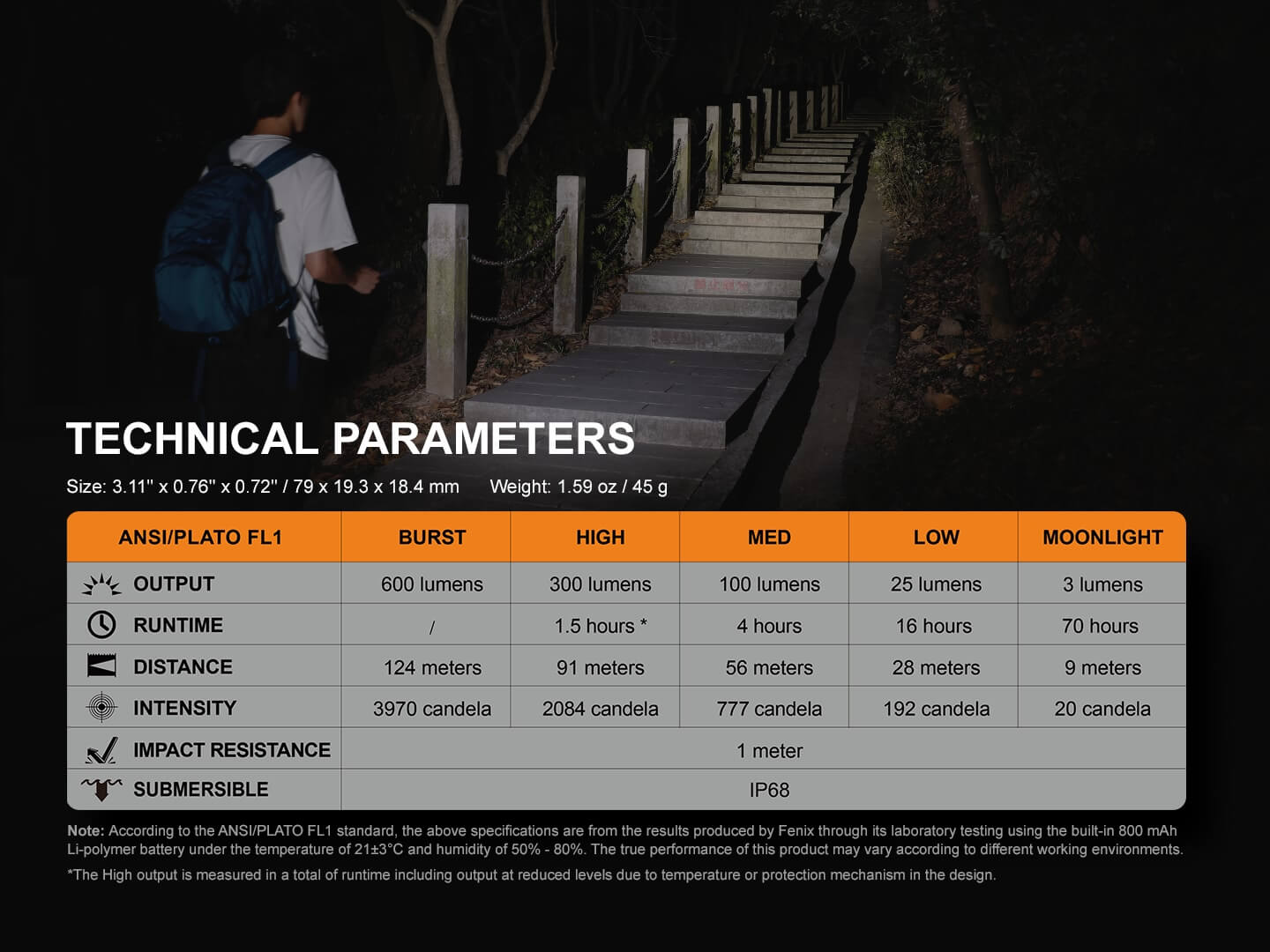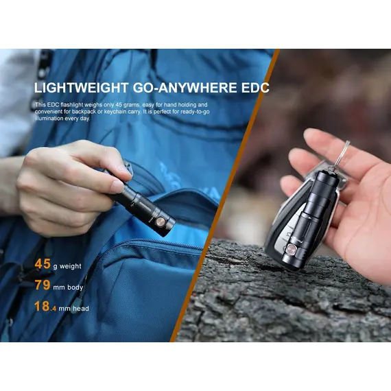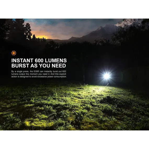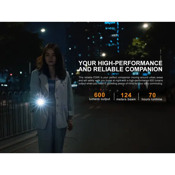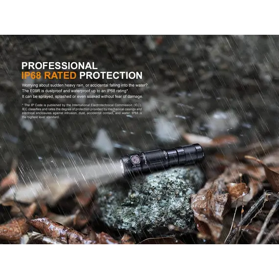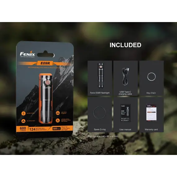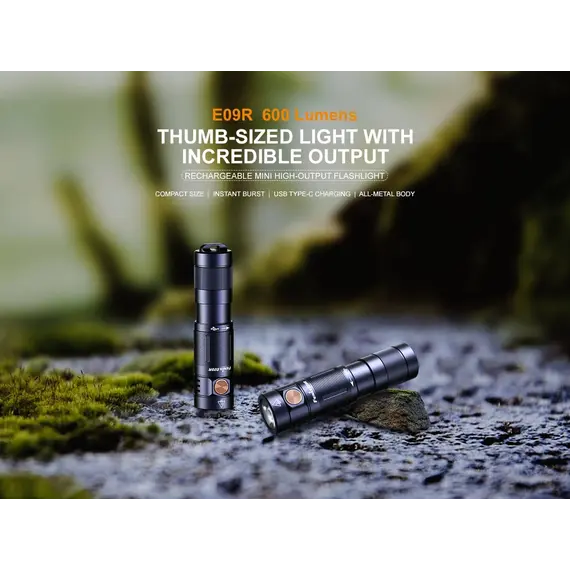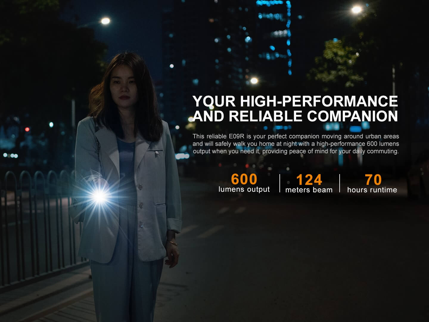 Ο Φακός Fenix E09R είναι επαναφορτιζόμενος φακός υψηλής απόδοσης με πολύ συμπαγές μέγεθος ενώ εκπέμπει έως και 600 lumens και η απόσταση δέσμης του φτάνει τα 124 μέτρα. Διαθέτει επαναφορτιζόμενη μπαταρία Li-polymer 800mAh και θύρα φόρτισης USB Type-C. Ο Φακός Fenix E09R έχει μέγιστο χρόνο λειτουργίας 70 ώρες. Παρέχει πρόσβαση σε τέσσερα επίπεδα φωτεινότητας με ένα απλό πάτημα του πλευρικού διακόπτη, ικανοποιώντας διάφορες απαιτήσεις φωτισμού. Με τον συμπεριλαμβανόμενο κρίκο κλειδιού, αυτός ο μικρός φακός είναι η τέλεια επιλογή για καθημερινή μεταφορά.