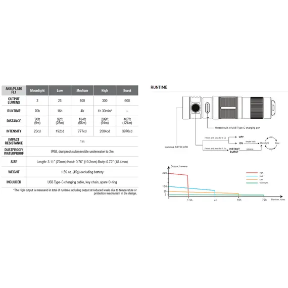 Λειτουργίες Φωτισμού: 4 επίπεδα φωτεινότητας, Burst mode 600 Lumens