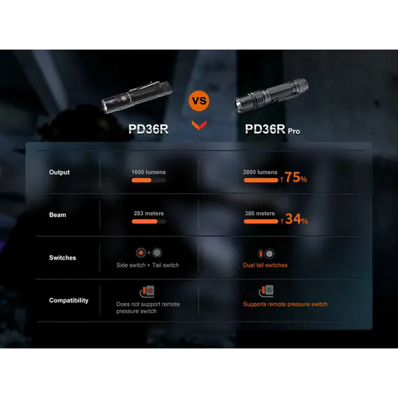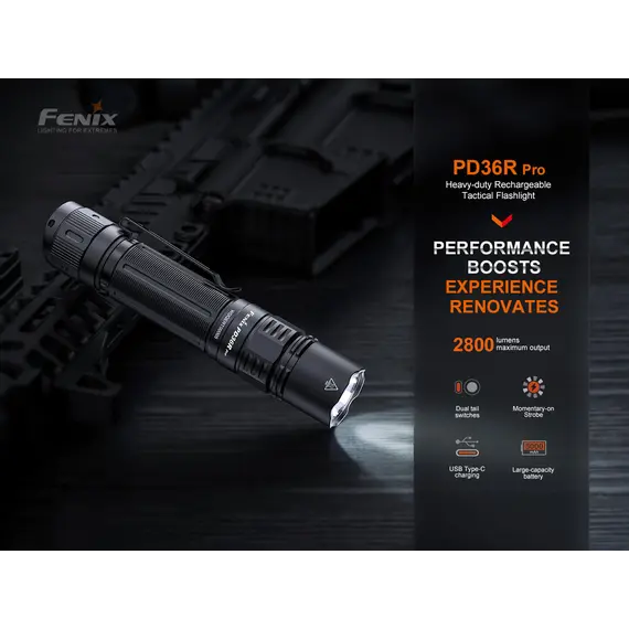 Φακός Fenix PD36R Pro Επαναφορτιζόμενος με USB Ο φακός PD36R με τις περισσότερες πωλήσεις της Fenix ​​έγινε PRO. Είναι ό,τι σας αρέσει στο PD36R, αλλά με λίγη περισσότερη ισχύ. Διαθέτοντας λειτουργία turbo 2800 lumen, αυτός ο φακός μπορεί να φωτίσει έως 380 μέτρα. Διπλό διακόπτης ελέγχου on/off, με δυνατότητα στιγμιαίας ενεργοποίησης και έξι λειτουργίες φωτισμού. Η μπαταρία των 5000mAh παρέχει άφθονη ισχύ για να διατηρεί αυτό το φακό σε λειτουργία έως και 42 ώρες και είναι επαναφορτιζόμενη USB Type-C. Στιβαρή κατασκευή, ο Φακός Fenix PD36R Pro είναι ανθεκτικός στην κρούση, ανθεκτικός στη σκόνη και αδιάβροχος κάτω από το νερό έως τα 2 μέτρα. Η μέγιστη φωτεινότητα και η σταθερή απόδοση κάνουν αυτόν τον φακό τον κατάλληλο για όλες τις ανάγκες φωτισμού.