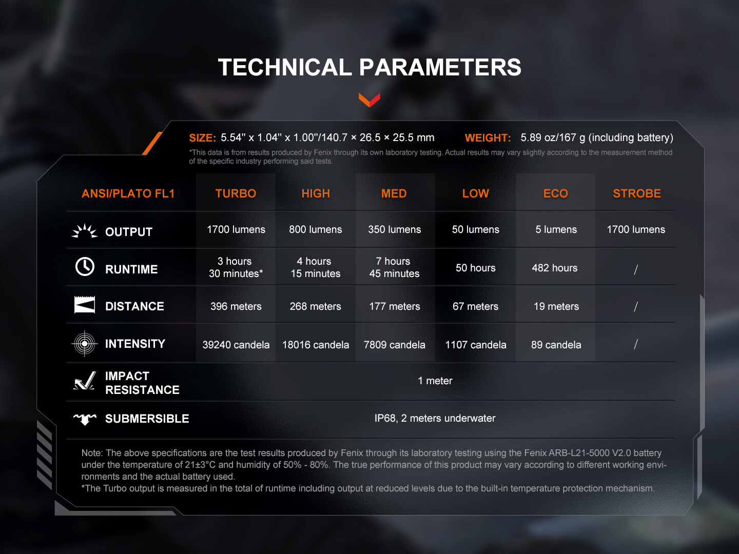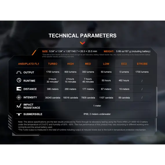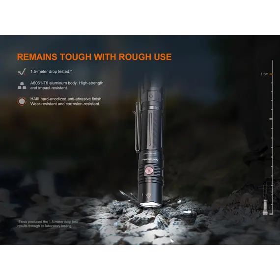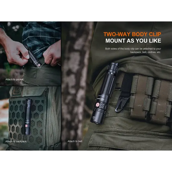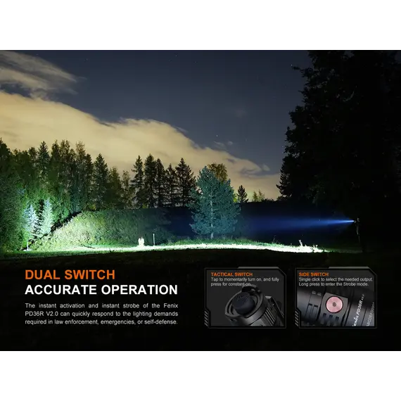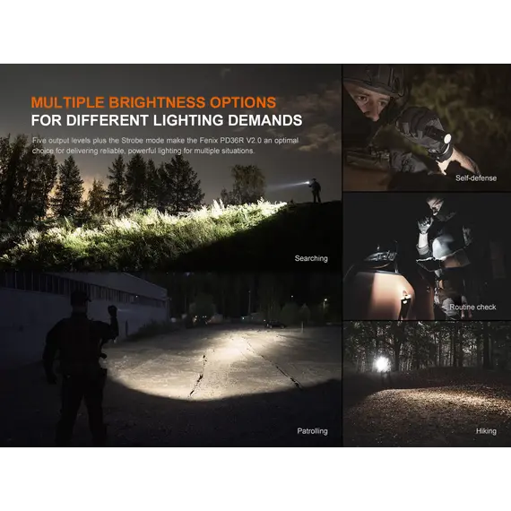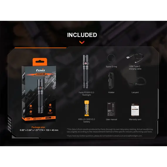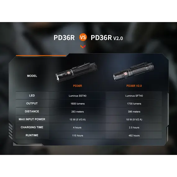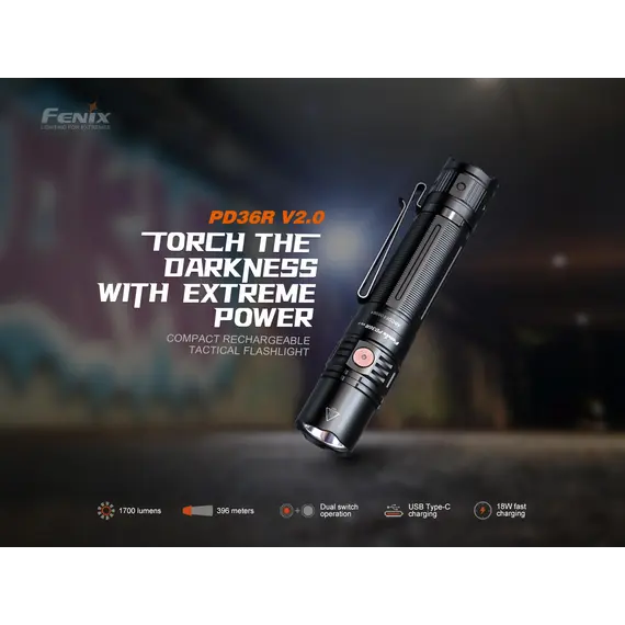 Φακός Fenix PD36R V2.0 Επαναφορτιζόμενος με USB Ο Φακός Fenix PD36R V2.0 είναι ένας φακός υψηλής ποιότητας που έχει σχεδιαστεί για όσους απαιτούν απαράμιλλη αξιοπιστία και απόδοση. Με μέγιστη φωτεινότητα 1700 lumens και εντυπωσιακή δέσμη 396 μέτρων, διασφαλίζει ότι κάθε μονοπάτι που ακολουθείτε είναι έντονα φωτισμένο και καθαρό. Ο Φακός Fenix PD36R V2.0 προσφέρει την άνεση της γρήγορης φόρτισης USB Type-C,  στα 18W που επαναφορτίζει τον φακό σας πλήρως σε μόλις 2,5 ώρες. Με εκπληκτικό χρόνο λειτουργίας 60 ημερών (Λειτουργία ECO 8 ώρες την ημέρα), αυτός ο φακός είναι ένας ανεκτίμητος σύντροφος για εκτεταμένες υπαίθριες περιπέτειες, διασφαλίζοντας ότι δεν θα μείνετε ποτέ στο σκοτάδι. Είναι σχολαστικά σχεδιασμένος με ένα ευέλικτο κλιπ σώματος 2 κατευθύνσεων, επιτρέποντας τη μεταφορά χωρίς χέρια όποτε χρειάζεται. Κανένα περιβάλλον δεν είναι πολύ σκληρό για το Fenix ​​PD36R V2, καθώς διαθέτει αξιοσημείωτη αδιάβροχη βαθμολογία (IP68), εξασφαλίζοντας βέλτιστη λειτουργικότητα ακόμη και στις πιο υγρές συνθήκες. Επιλέξτε το Fenix ​​PD36R V2.0 και μπείτε σε έναν κόσμο ασυναγώνιστου φωτισμού και διαρκούς ποιότητας.