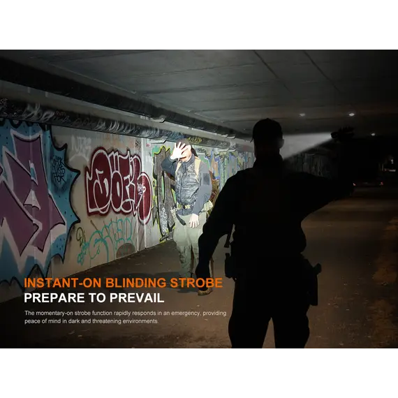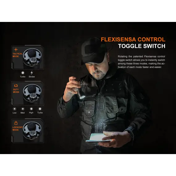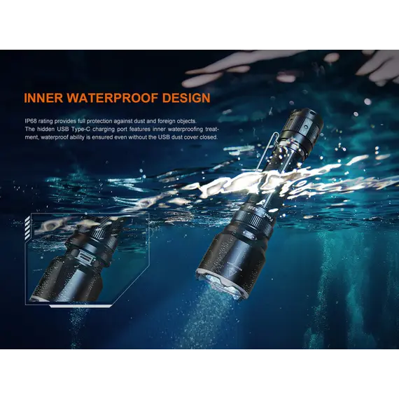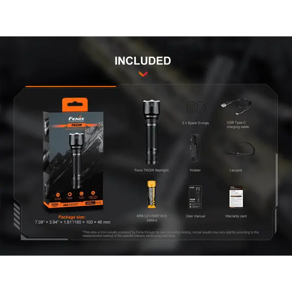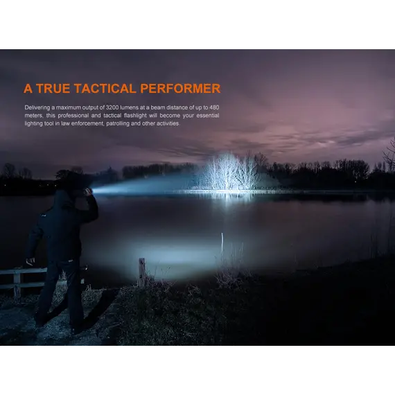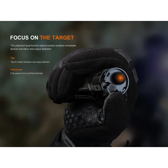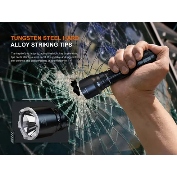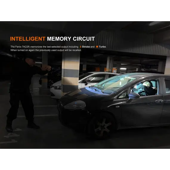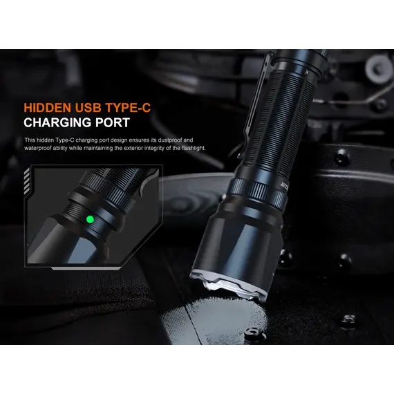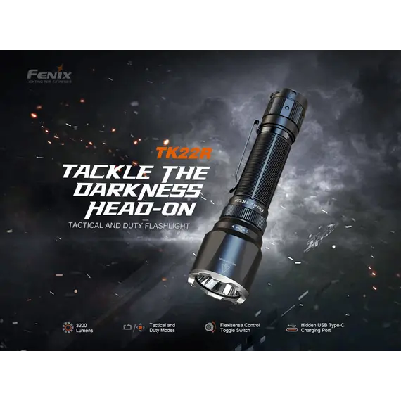 Φακός Fenix TK22R Επαναφορτιζόμενος με USB Ο Φακός Fenix TK22R διαθέτει μέγιστο 3200 lumens με απόσταση δέσμης έως και 480 μέτρα. Ο διακόπτης FlexiSensa σας επιτρέπει να κάνετε εναλλαγή μεταξύ της λειτουργίας Tactical, μόνο για Turbo/Strobe, και της λειτουργίας Duty σε ένα πάτημα για όλα τα επίπεδα φωτεινότητας και της λειτουργίας Lock Out για αποφυγή τυχαίας ενεργοποίησης. Η έξυπνη μνήμη θυμάται το τελευταίο επίπεδο φωτεινότητας στο οποίο έχετε πρόσβαση, και στις δύο λειτουργίες. Επαναφορτίστε γρήγορα τον φακό ξεβιδώνοντας το κάλυμμα της θύρας και συνδέοντας το καλώδιο USB Type-C. Η κρουστική στεφάνη διαθέτει μύτες που σπάνε γυαλί. Ανθεκτικό στις κρούσεις και αδιάβροχο ακόμα κι αν η θύρα φόρτισης είναι εκτεθειμένη.