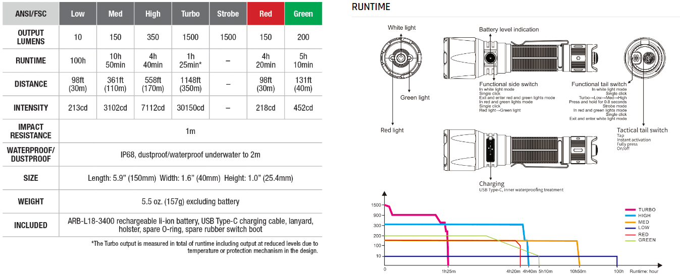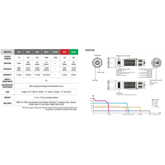 Μπαταρία: Αποσπώμενη επαναφορτιζόμενη μπαταρία ARB-L18-3400 συμπεριλαμβάνετε, ή 2*CR123A Δεν Συμπεριλαμβάνετε