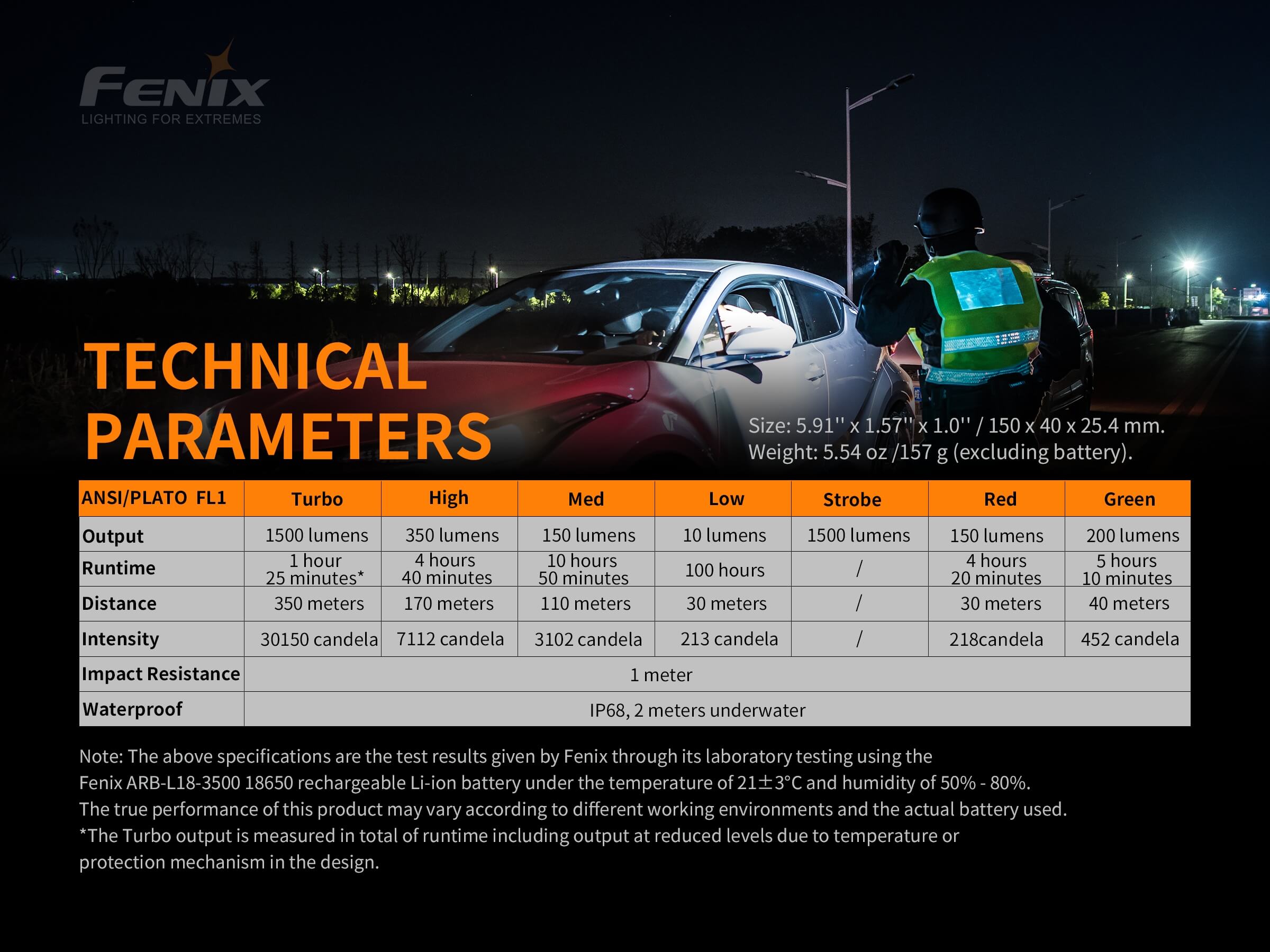 Λειτουργίες Φωτισμού: 5 επίπεδα φωτεινότητας, Στροβιλισμός, πράσινο φως, κόκκινο φως Τύπος λαμπτήρα: Cree XP_E2(red and green lights) and LUMINUS SST40LEDs (cool white) Μέγεθος: Μήκος 15,0mm, Κεφαλή 40mm, Κορμός 25,4mm