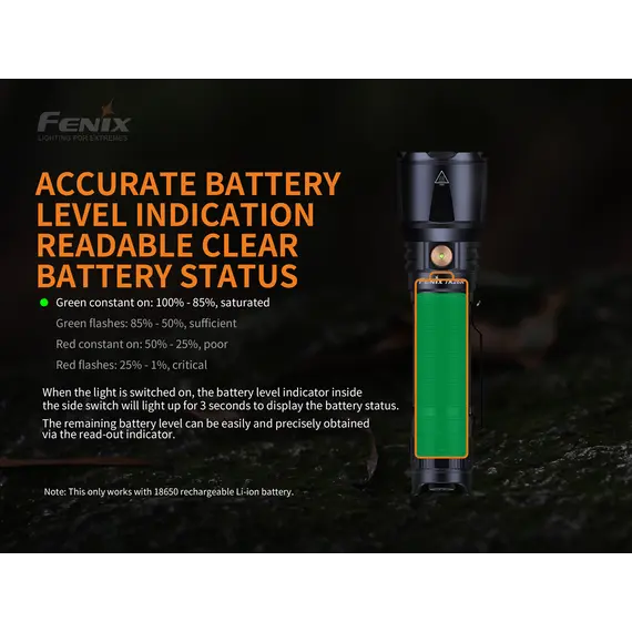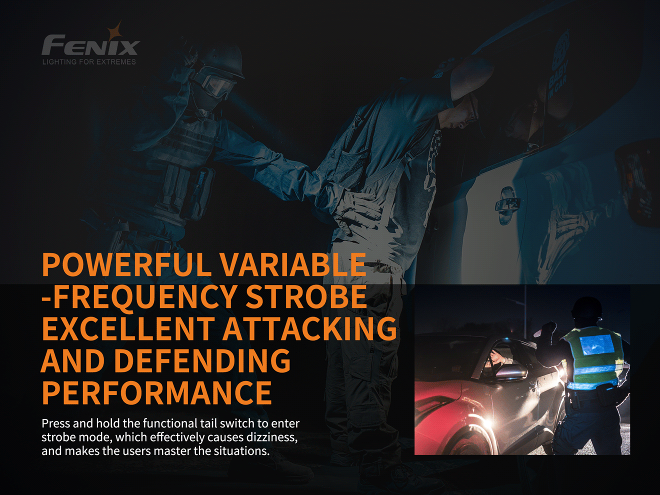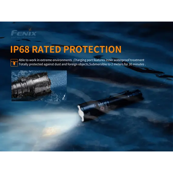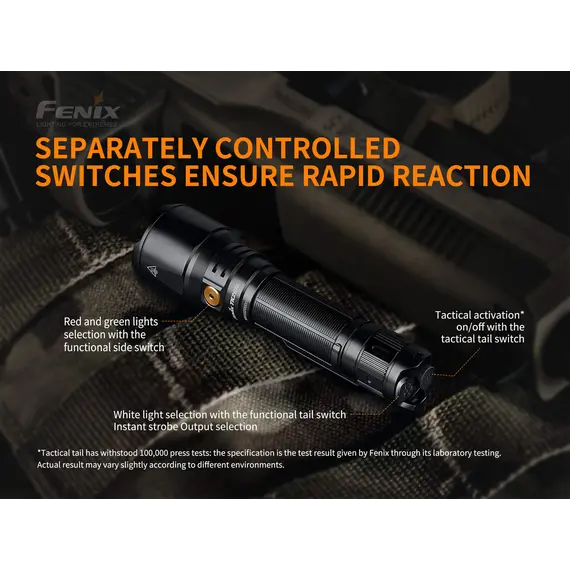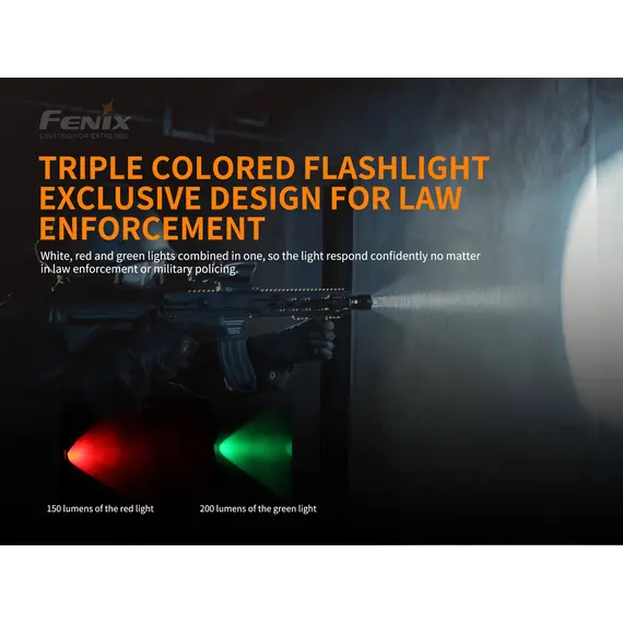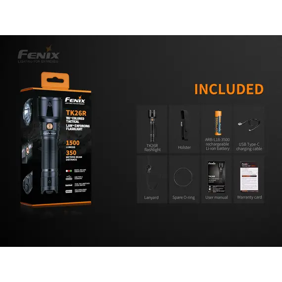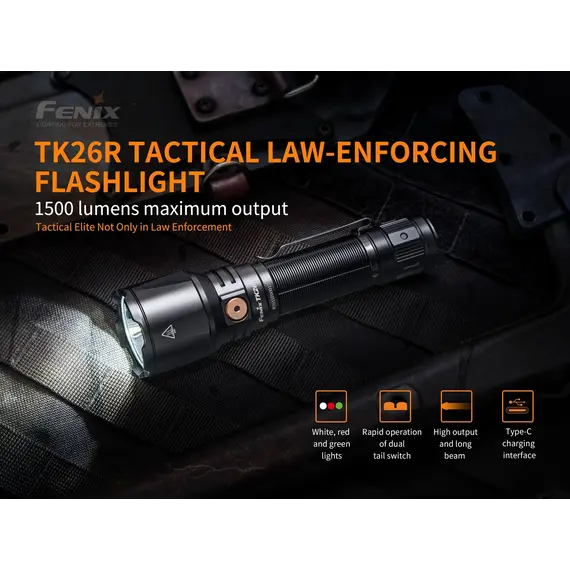 Φακός Fenix TK26R Επαναφορτιζόμενος με USB Ο Φακός Fenix ​​TK26R είναι ένας Επιχειρησιακός φακός πολλαπλών χρήσεων που διαθέτει απίστευτη απόδοση εκτοξεύοντας μέγιστο 1500 lumens και απόσταση δέσμης έως και 350 μέτρα. Επιλέξετε εύκολα και γρήγορα ανάμεσα σε 6 λειτουργίες (4 φωτισμού, κόκκινου φωτός Πράσινου φωτός, Στροβιλισμού), χρησιμοποιώντας τον διπλό επιχειρησιακό ουραίου διακόπτη, αλλά και τον διακόπτη στο σώμα του φακού (Για επιλογή πράσινου ή κόκκινου φωτός). Ο Φακός Fenix TK26R είναι ανθεκτικός στις κρούσεις και αδιάβροχος (IP68),  όλα τα παραπάνω χαρακτηριστικά καθιστούν τον Φακό TK26R ιδανικό για επιχειρησιακή χρήση. Η συμπεριλαμβανόμενη μπαταρία ιόντων λιθίου 5000 mAh μπορεί να φορτιστεί άνετα μέσω της θύρας USB Type-C του φακού, καθιστώντας τον φακό TK26R το ιδανικό εργαλείο για επιχειρησιακή απόδοση υψηλής έντασης και μεγάλης διάρκειας. Ο Φακός Fenix TK26R έχει μνήμη, δηλαδή ανάβει στο επίπεδο φωτεινότητας που επιλέξατε κατά την τελευταία χρήση του.