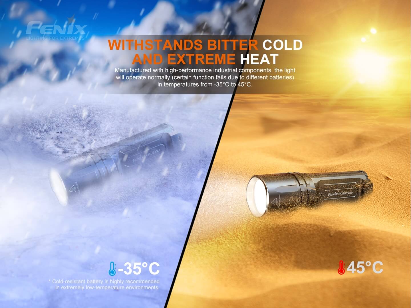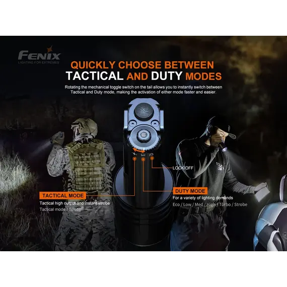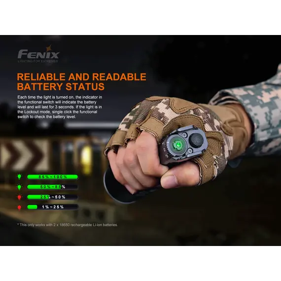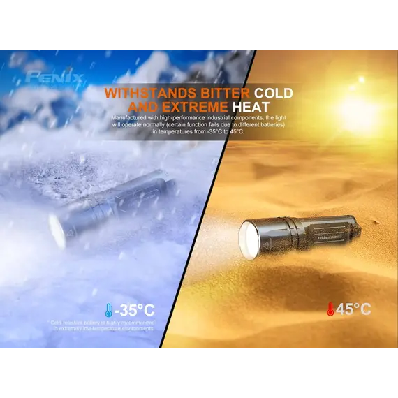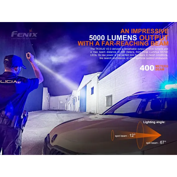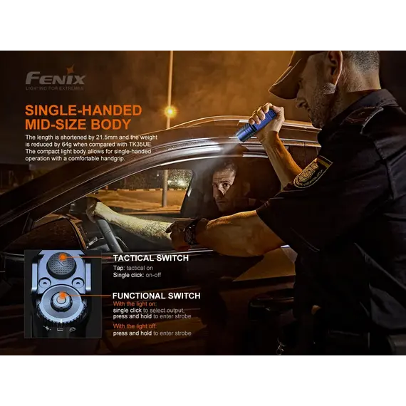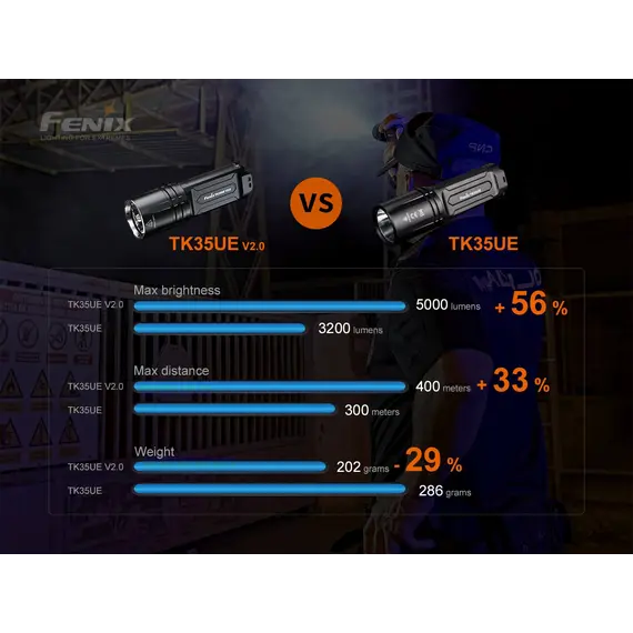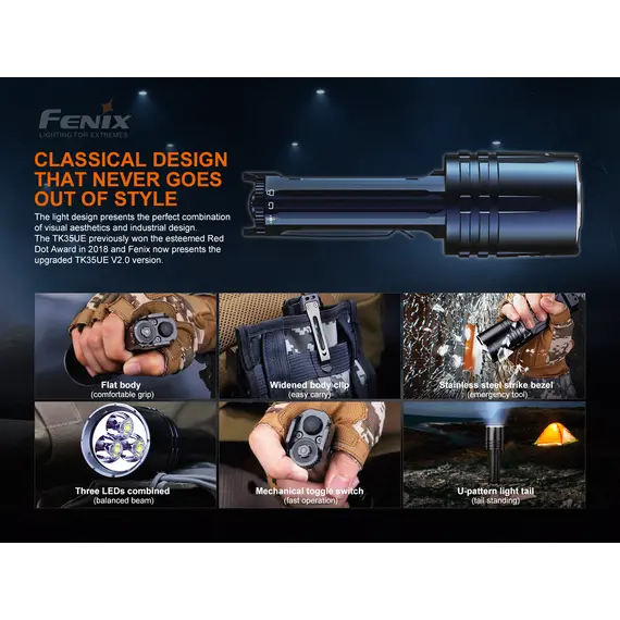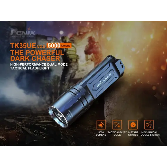 Ο φακός Fenix TK35UE V2.0 αναβαθμίστηκε πρόσφατα για να παρέχει μέγιστη απόδοση 5000 lumens. Ο πρωτοποριακός διακόπτης εναλλαγής σας επιτρέπει να κάνετε γρήγορη εναλλαγή μεταξύ Επιχειρησιακής λειτουργίας, λειτουργίας καθήκοντος και λειτουργίας κλειδώματος. Η ένδειξη μπαταρίας σάς ενημερώνει εάν οι δύο μπαταρίες Li-ion 18650 (δεν περιλαμβάνονται) χρειάζονται φόρτιση. Αδιάβροχος (IP68), ανθεκτικός στη σκόνη και στα χτυπήματα με μέγιστο χρόνο λειτουργίας 85 ωρών στη λειτουργία Eco, ο φακός TK35UE V2.0 είναι έτοιμος να καλύψει εύκολα τις ανάγκες οποιουδήποτε λάτρη του εξωτερικού χώρου, καθώς και των στρατιωτικών και των αρχών επιβολής του νόμου.