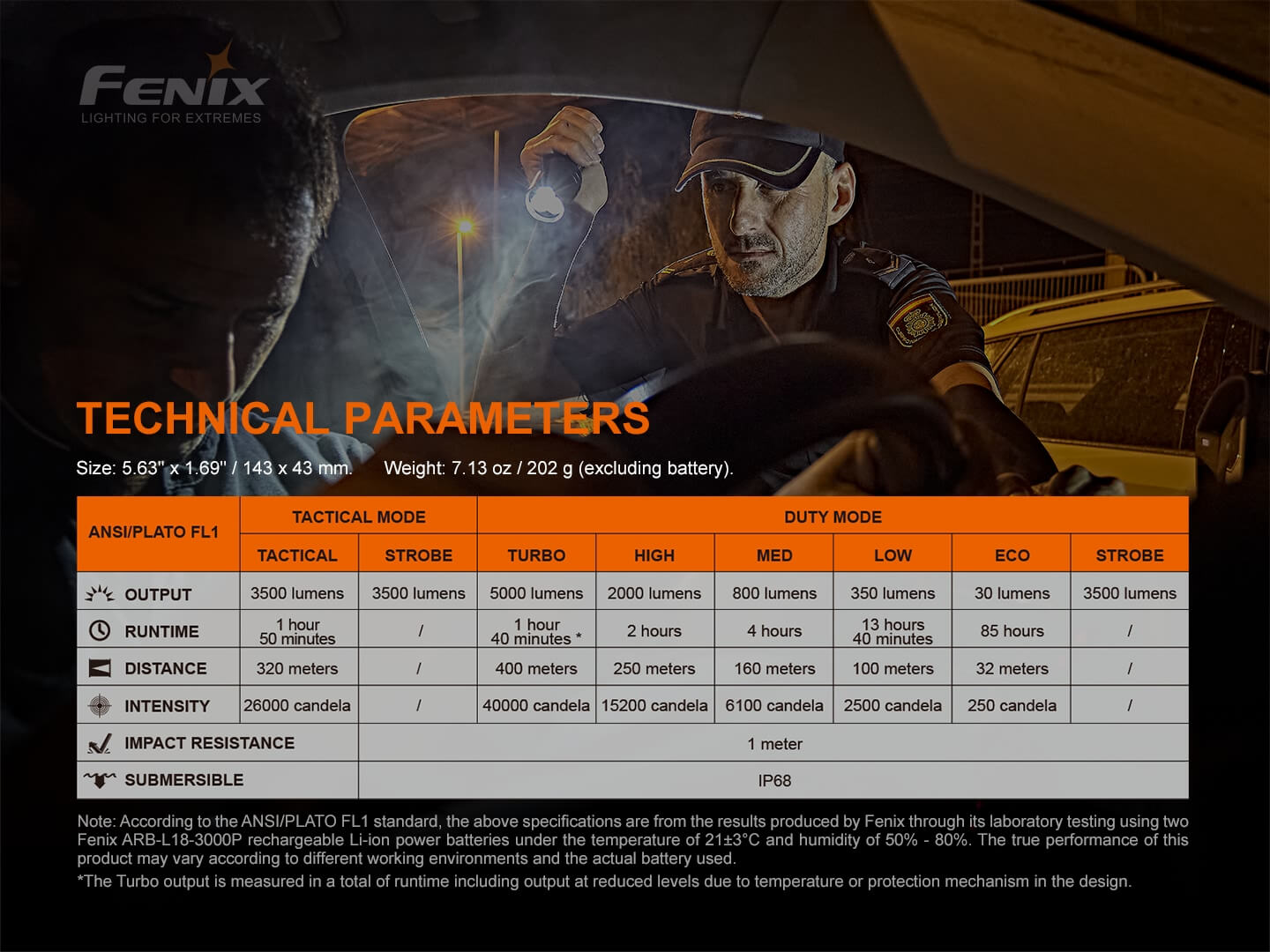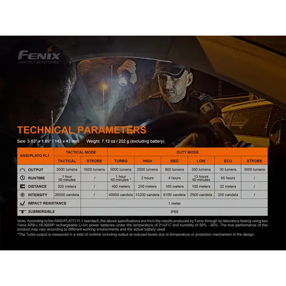 Λειτουργίες Φωτισμού: Επιχειρησιακή λειτουργία Turbo 5000 Lumens,Στροβιλισμός, Λειτουργίας Καθήκοντος 5 επίπεδα φωτεινότητας, Στροβιλισμός