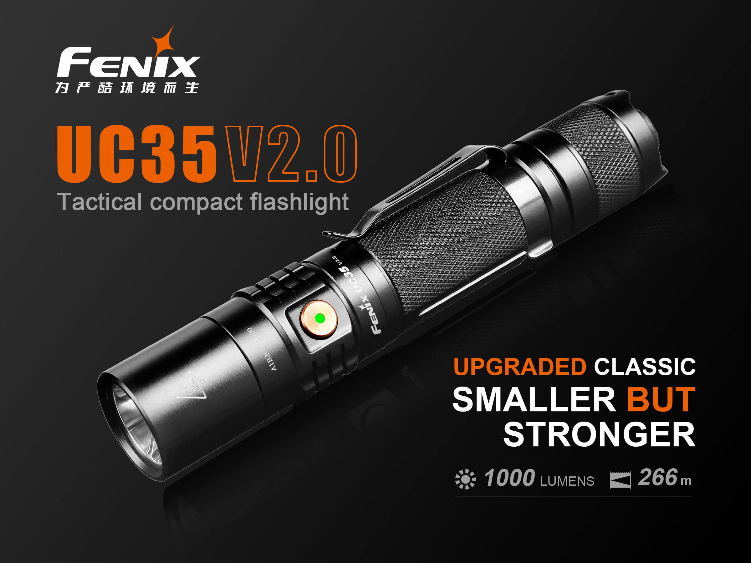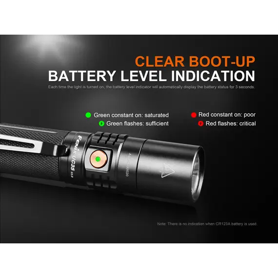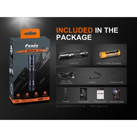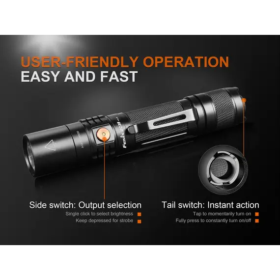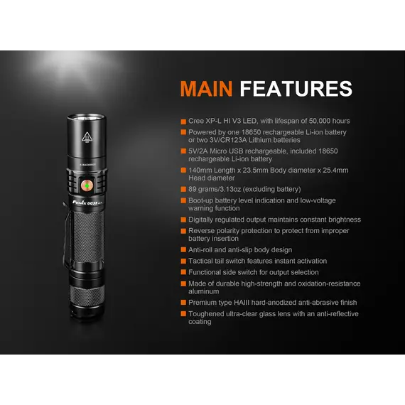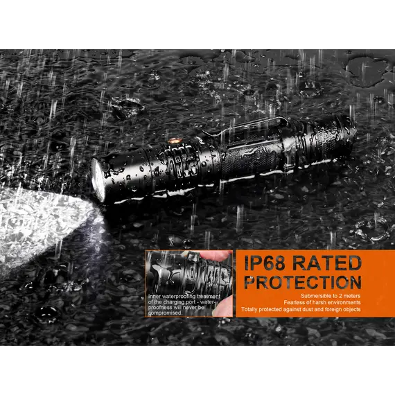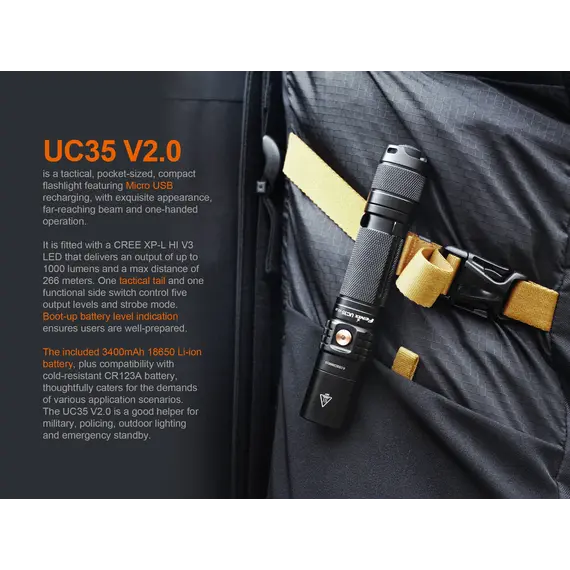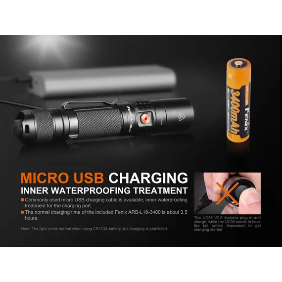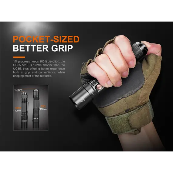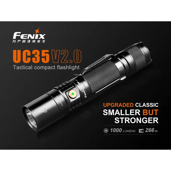 Ο Φακός Fenix UC35 V2.0 είναι ένας ισχυρός φακός καθημερινής μεταφοράς με μέγιστη απόδοση 1000 lumens. Ενεργοποιήστε τον Φακό Fenix UC35 V2.0 με τον ουραίο διακόπτη και περάστε σε έξι λειτουργίες φωτισμού από τον πλευρικό διακόπτη. Η επαναφορτιζόμενη Micro-USB θύρα με ένδειξη στάθμης μπαταρίας βοηθά να διατηρείτε τον φακό σας φορτισμένο και έτοιμο. Ο Φακός Fenix UC35 V2.0 είναι ανθεκτικός και αδιάβροχος με πιστοποίηση IP68, θα έχετε έναν φακό που δεν θα σας απογοητεύσει.