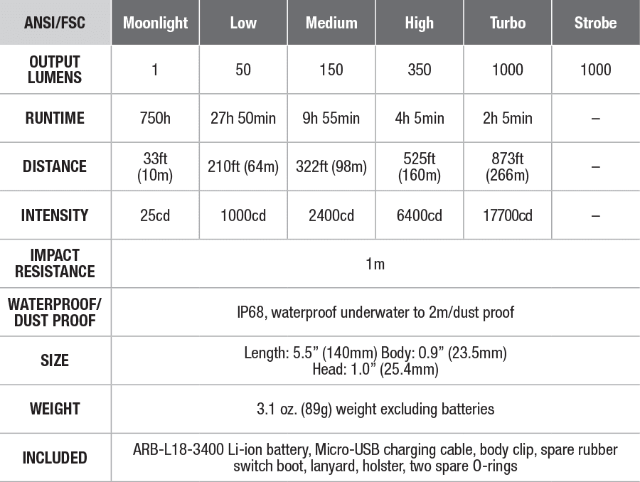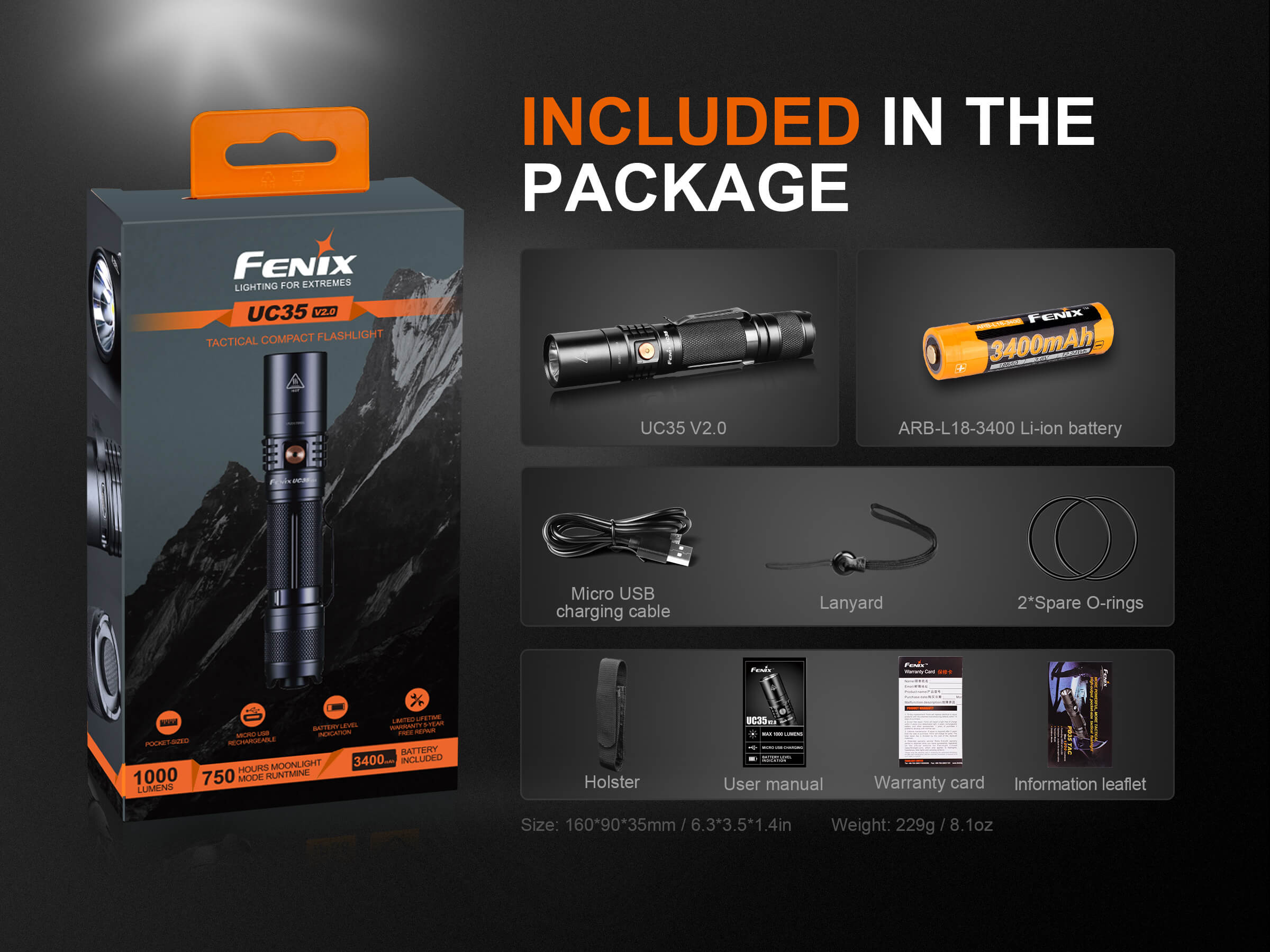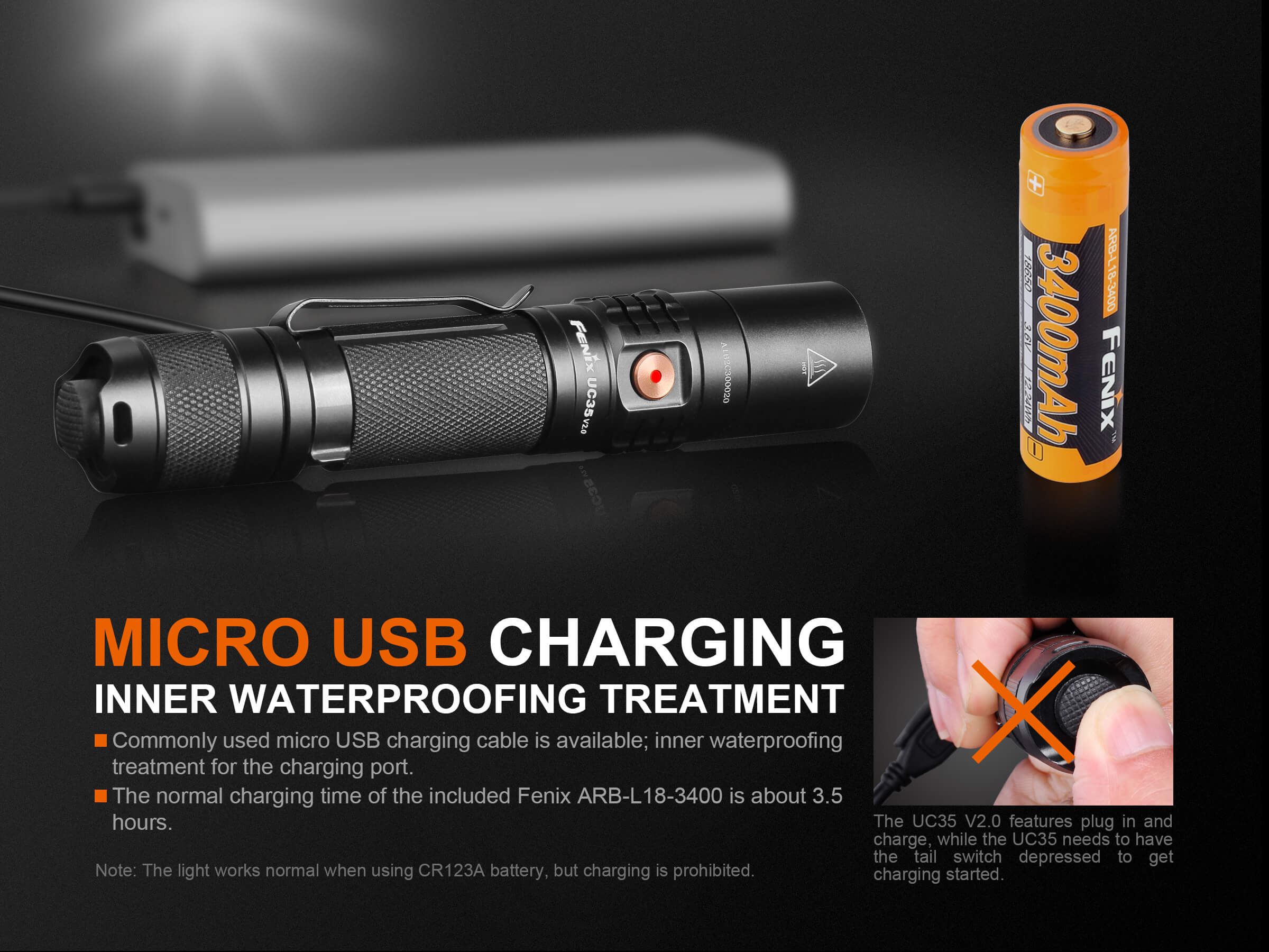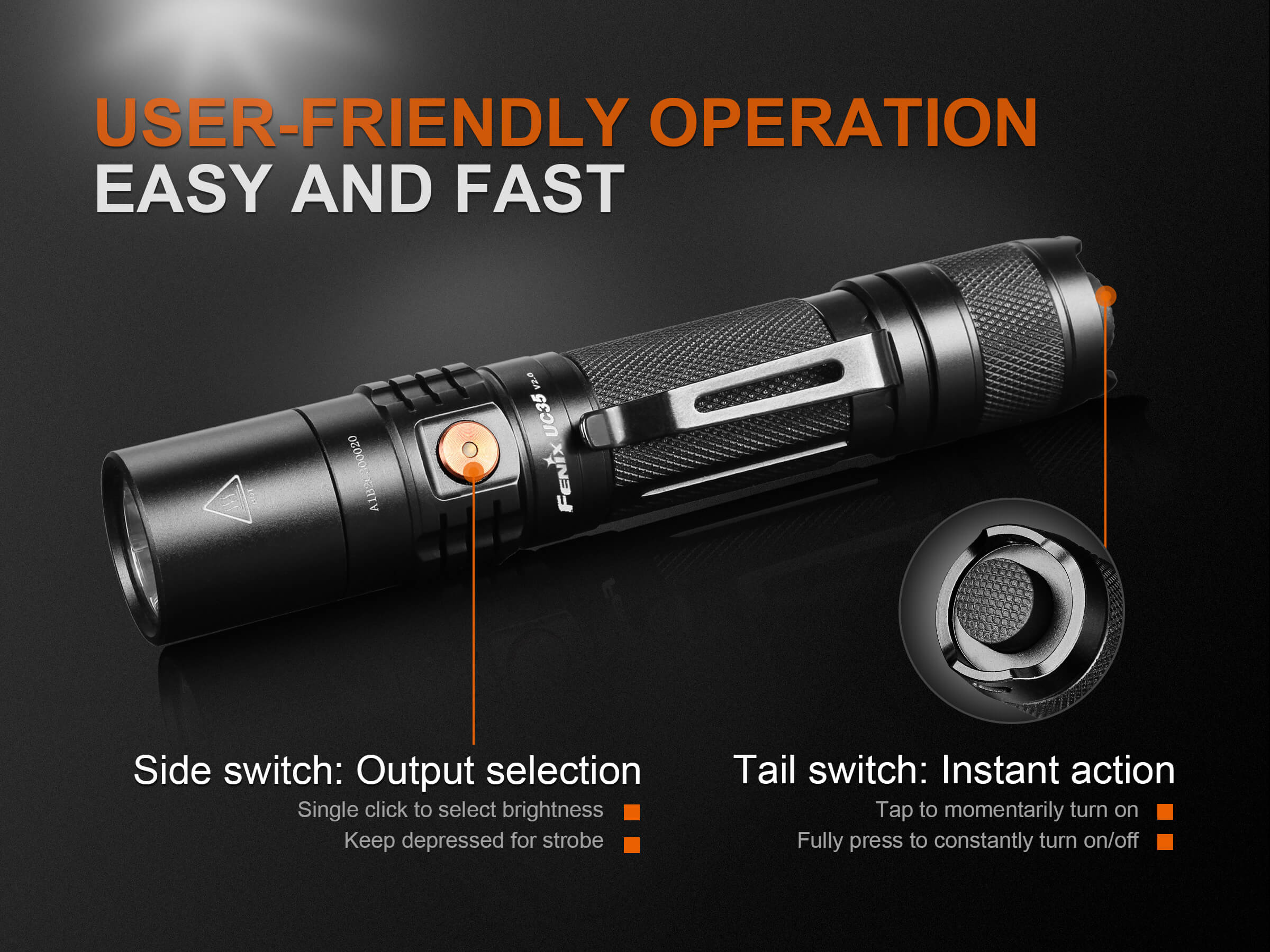 Ο Φακός Fenix UC35 V2.0 είναι ένας ισχυρός φακός καθημερινής μεταφοράς με μέγιστη απόδοση 1000 lumens. Ενεργοποιήστε τον Φακό Fenix UC35 V2.0 με τον ουραίο διακόπτη και περάστε σε έξι λειτουργίες φωτισμού από τον πλευρικό διακόπτη. Η επαναφορτιζόμενη Micro-USB θύρα με ένδειξη στάθμης μπαταρίας βοηθά να διατηρείτε τον φακό σας φορτισμένο και έτοιμο. Ο Φακός Fenix UC35 V2.0 είναι ανθεκτικός και αδιάβροχος με πιστοποίηση IP68, θα έχετε έναν φακό που δεν θα σας απογοητεύσει.