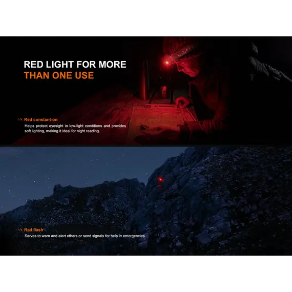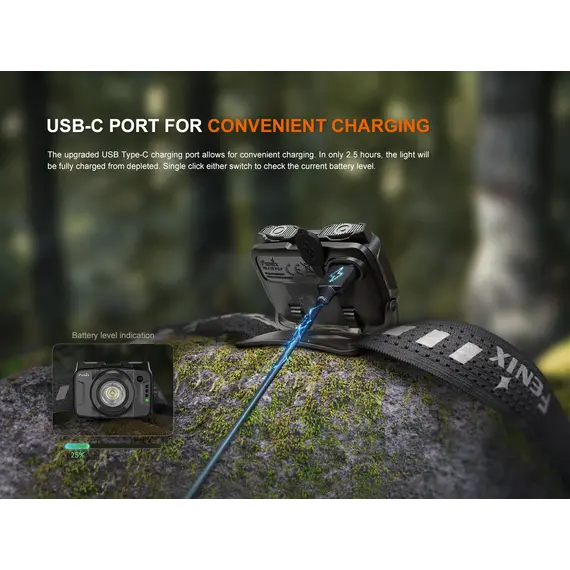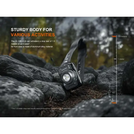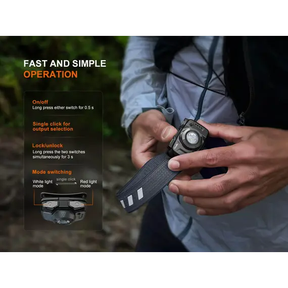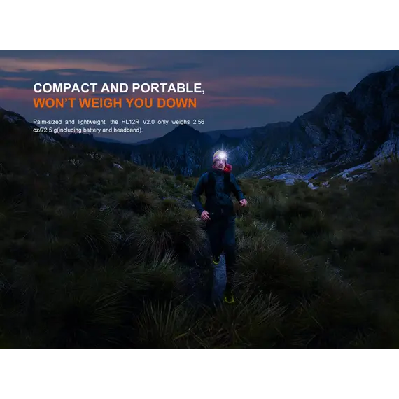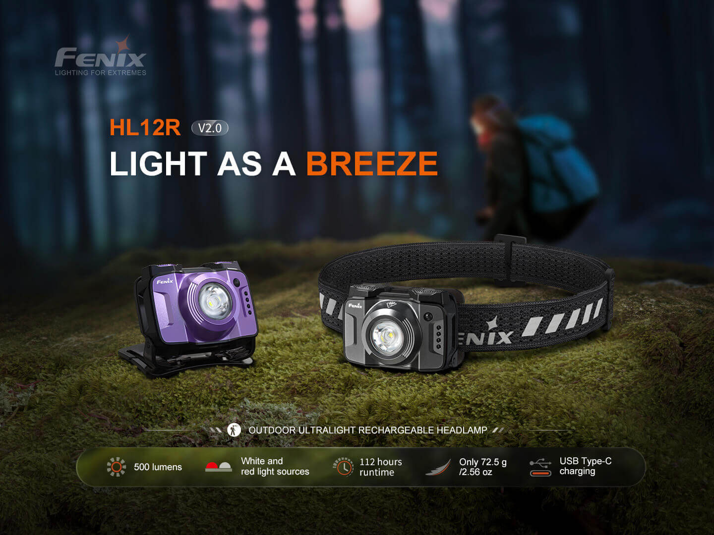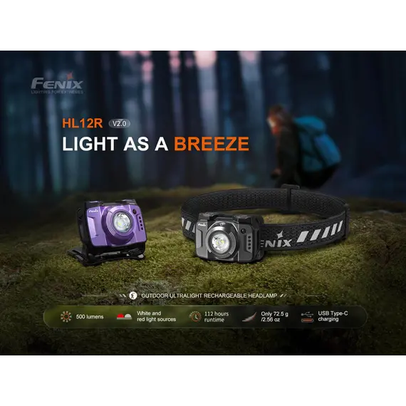 Φακός Κεφαλής Fenix HL12R V2.0 Επαναφορτιζόμενος με USB Ο φακός κεφαλής Fenix Fenix HL12R V2.0 είναι κατασκευασμένος για όσους αρνούνται να επιβραδύνουν. Διαθέτει μέγιστη φωτεινότητα 500 lumens και απόσταση δέσμης 125 μέτρων, είναι ιδανικός για τζόκινγκ ή και ολονύχτιες εκδρομές. Επιλέξτε μεταξύ των λειτουργιών λευκού, θερμού λευκού και κόκκινου φωτός με τα εύχρηστα επάνω διπλά κουμπιά, επιτρέποντας γρήγορες και ακριβείς αλλαγές λειτουργίας. Σε μόλις 72.5 Γραμμάρια, είναι ένας εξαιρετικά ελαφρύς προβολέας—ιδανικός για τρέξιμο. Ο HL12R V2.0 διαθέτει λειτουργεία κλειδώματος για την αποφυγή τυχαίας ενεργοποίησης και σύστημα κεφαλόδεσμου διπλής κατεύθυνσης που ρυθμίζεται εύκολα για ασφαλή και άνετη εφαρμογή. Επαναφορτίστε με USB-C (εμπεριέχεται) όταν χρειάζεται. Όποια πρόκληση κι αν είναι μπροστά σας, ο προβολέας Fenix HL12R V2.0 είναι κατασκευασμένος για να σας κρατά δυνατούς.