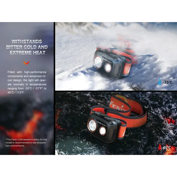 Ο επαναφορτιζόμενος Φακός Κεφαλής Fenix HL32R-T φωτίζει εύκολα τη διαδρομή σας. Οι ανεξάρτητοι διακόπτες ελέγχουν τις επτά λειτουργίες του φακού κεφαλής, συμπεριλαμβανομένου ενός προβολέα μεγάλης εμβέλειας με μέγιστο τα 800 lumens. Κατασκευασμένος από κράμα μαγνησίου, ο Φακός Κεφαλής Fenix HL32R-T δεν είναι μόνο ανθεκτικός αλλά εξαιρετικά ελαφρύς. Το SPORT Headband Fit System εξασφαλίζει ασφαλή και άνετη εφαρμογή. Η μπαταρία του Φακού Κεφαλής Fenix HL32R-T φορτίζεται μέσω της θύρας USB Type-C και η ένδειξη στάθμης μπαταρίας σας ενημερώνει για την υπολειπόμενη διάρκεια ζωής της μπαταρίας πριν ξεκινήσετε την περιπέτειά σας. Εμπιστευτείτε τον Φακό Κεφαλής Fenix HL32R-T για μακροχρόνια και άνετη απόδοση.