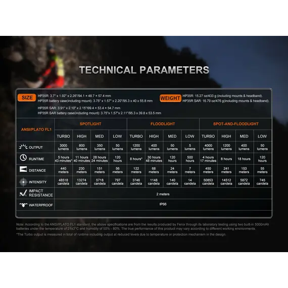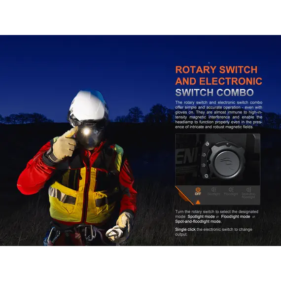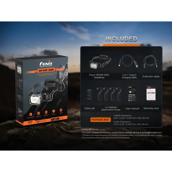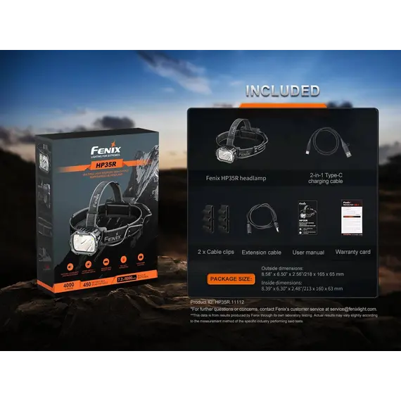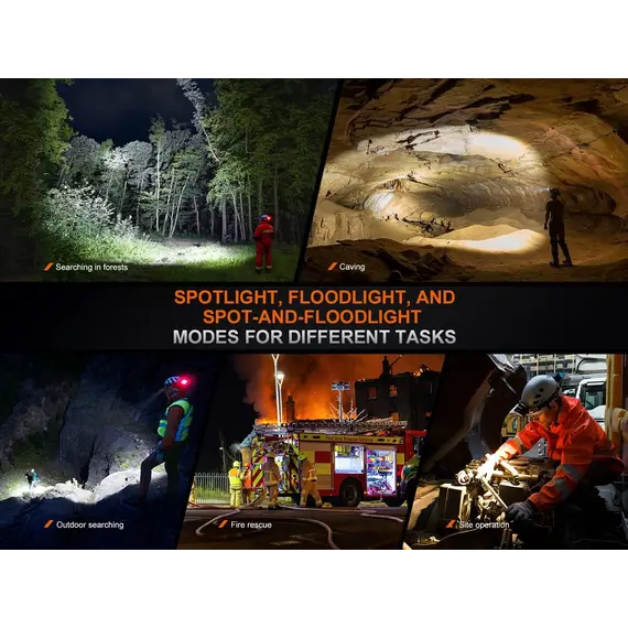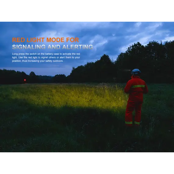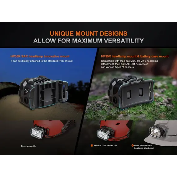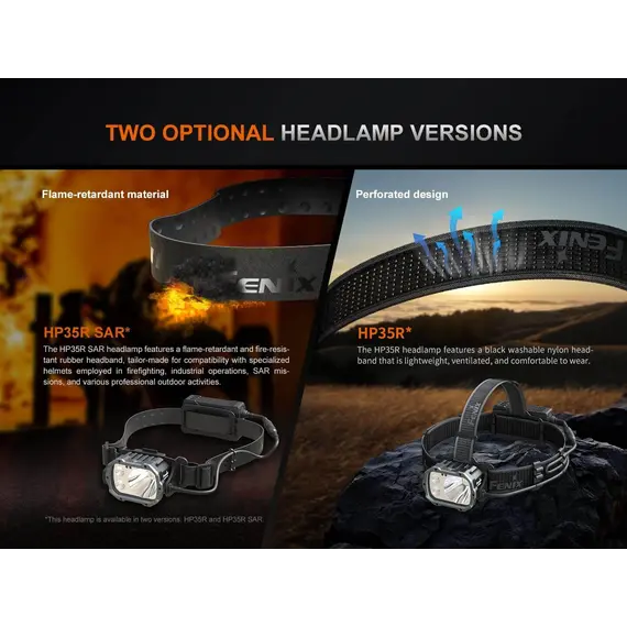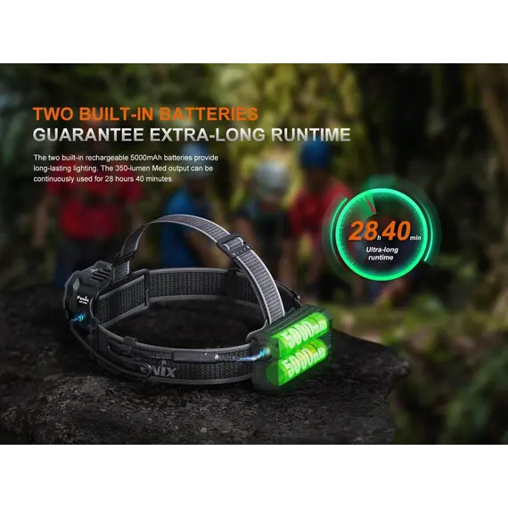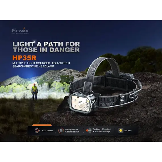 Φακός Κεφαλής Fenix HP35R Επαναφορτιζόμενος με USB Ο Φακός Κεφαλής Fenix HP35R είναι φτιαγμένος για επαγγελματίες και κατασκευασμένος για τα άκρα, ο επαναφορτιζόμενος επαγγελματικός φακός Fenix HP35R είναι κατασκευασμένος για μέγιστη απόδοση. Ο περιστροφικός σύνθετος διακόπτης και ο διακόπτης κουμπιού σας επιτρέπει να επιλέξετε μεταξύ διαφορετικών επιπέδων φωτιστισμό πλημύρας (Flood Light) ή στοχευμένο (Spotlight) ή και των δύο, αποδίδει εντυπωσιακά 4000 lumen μέγιστο με ακτίνα 450 μέτρα. Ο Φακός Κεφαλής Fenix HP35R περιέχει δύο ενσωματωμένες μπαταρίες 5000 mAh και μπορεί να χρησιμοποιηθεί ως power bank για τη φόρτιση άλλων συσκευών. Στη θήκη της μπαταρίας είναι ενσωματωμένη μια κόκκινη λυχνία ασφαλείας που χρησιμοποιείται για να ειδοποιεί άλλους για την τοποθεσία σας.