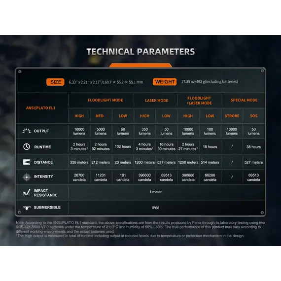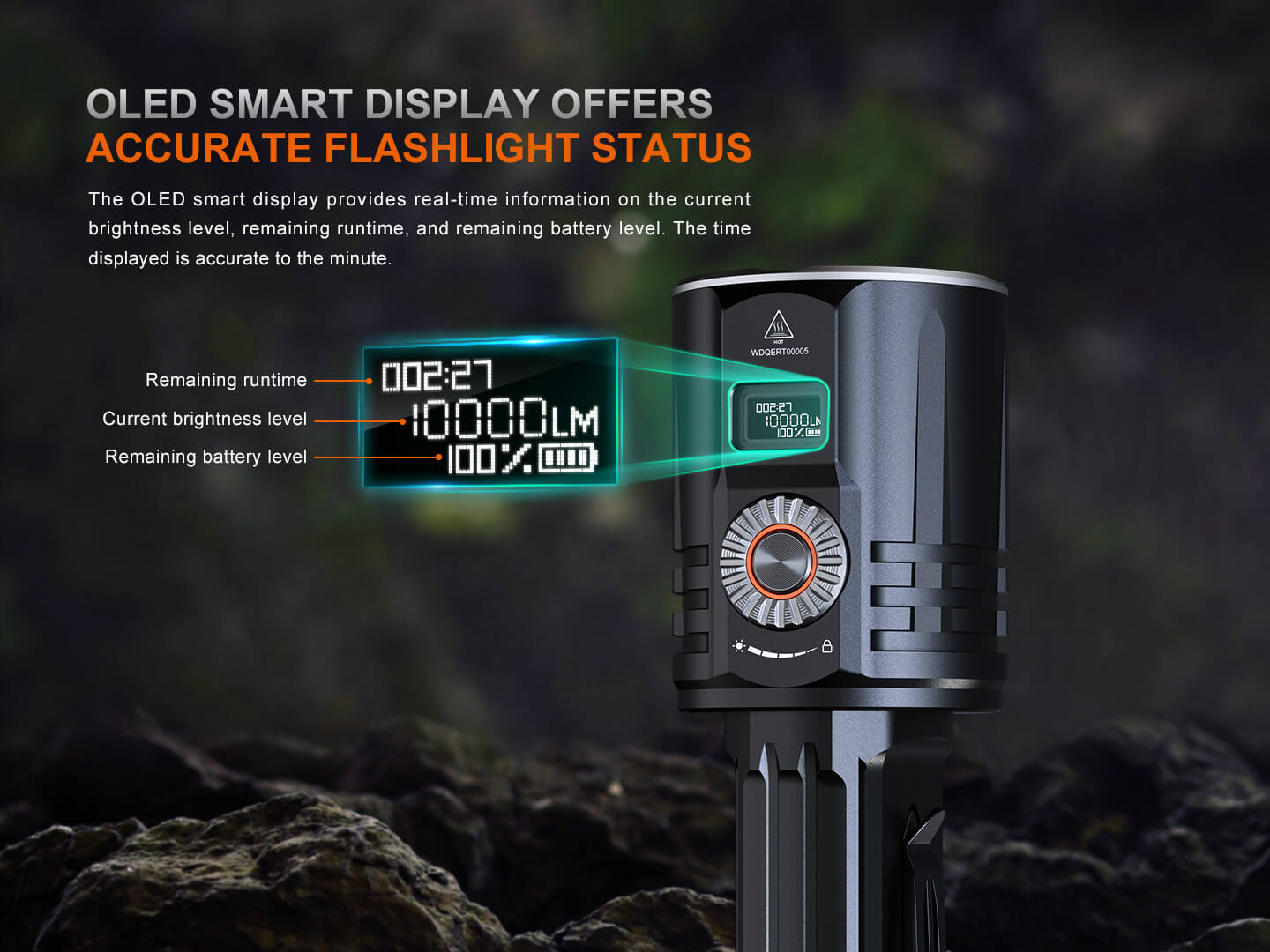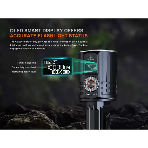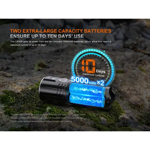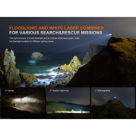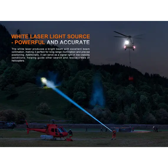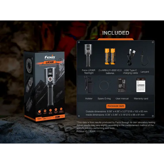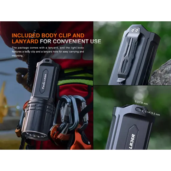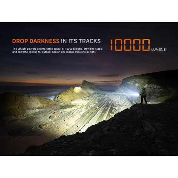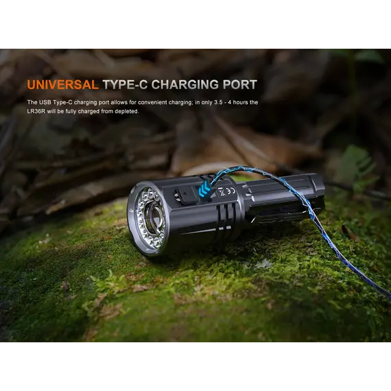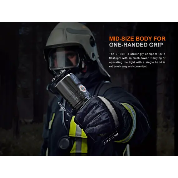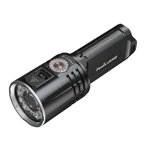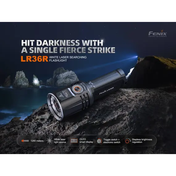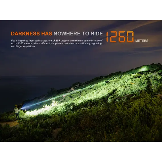 Φακός Laser Fenix LR36R Επαναφορτιζόμενος με USB Ο Φακός Laser Fenix LR36R είναι ένας ισχυρός φακός που συνδυάζει έναν προβολέα 10.000 lumen και ένα λευκό λέιζερ σε ένα ευέλικτο εργαλείο. Η λευκή δέσμη λέιζερ του φτάνει τα εντυπωσιακά 1260 μέτρα, ενώ ο προβολέας εξασφαλίζει φωτισμό ευρείας περιοχής. Η έξυπνη οθόνη OLED σας κρατά ενήμερους με ενημερώσεις σε πραγματικό χρόνο για τις ρυθμίσεις σας και ο περιστρεφόμενος επιλογέας προσφέρει ακριβή, αδιάκοπο έλεγχο φωτεινότητας. Με πέντε λειτουργίες—Floodlight, Laser, Floodlight + Laser, Strobe και SOS—θα έχετε πάντα τον σωστό φωτισμό στα χέρια σας. Τροφοδοτούμενο από διπλές επαναφορτιζόμενες μπαταρίες Li-ion 21700, Ο Fenix LR36R προσφέρει έως και 102 ώρες χρόνου λειτουργίας. Με το Fenix LR36R, έχετε τον τέλειο συνδυασμό ισχύος, ακρίβειας και αξιοπιστίας σε έναν φακό.