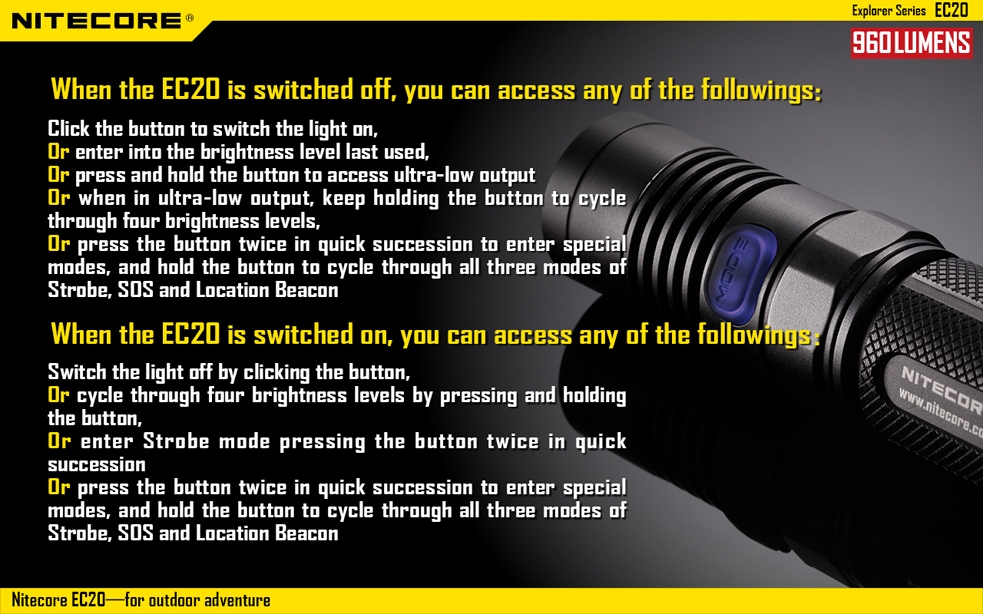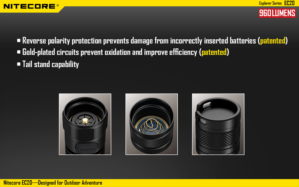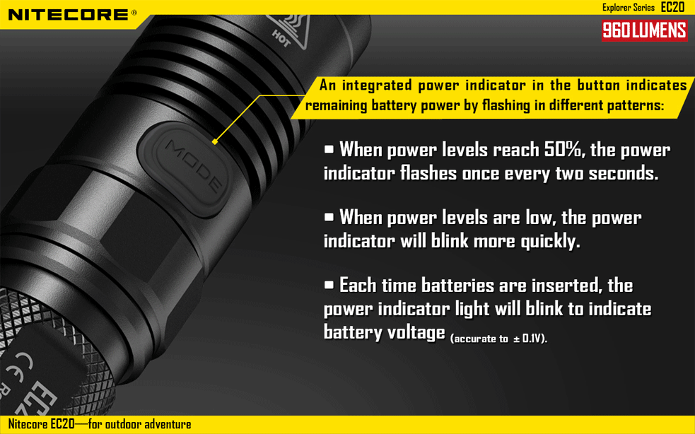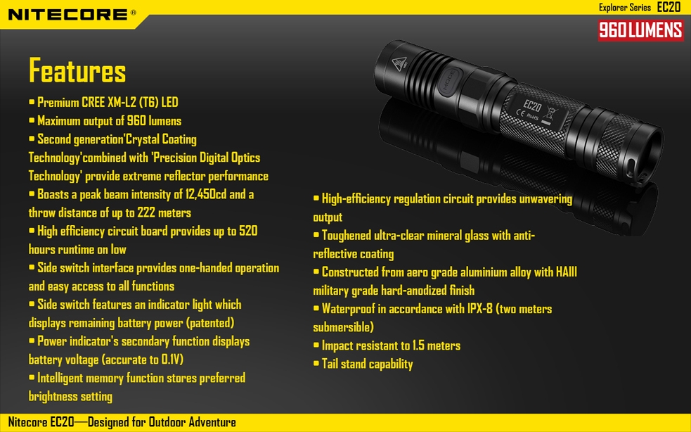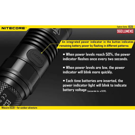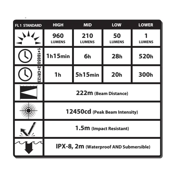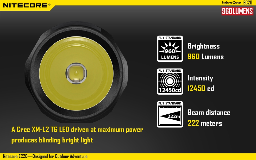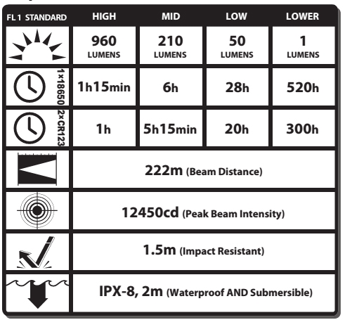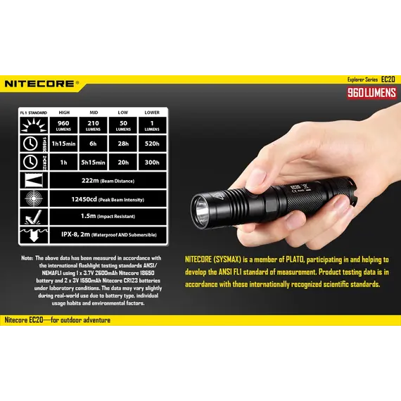 Τα παραπάνω στοιχεία έχουν μετρηθεί σύμφωνα με τα διεθνές πρότυπα δοκιμών των φακών ANSI / NEMA FL1 χρησιμοποιώντας 1 επαναφορτιζόμενη μπαταρία NITECORE 3.7V / 2600mAh μέγεθος 18650 ή 2 μπαταρίες λιθίου μίας χρήσης NITECORECR123 (3v / 1550mAh), υπό εργαστηριακές συνθήκες.