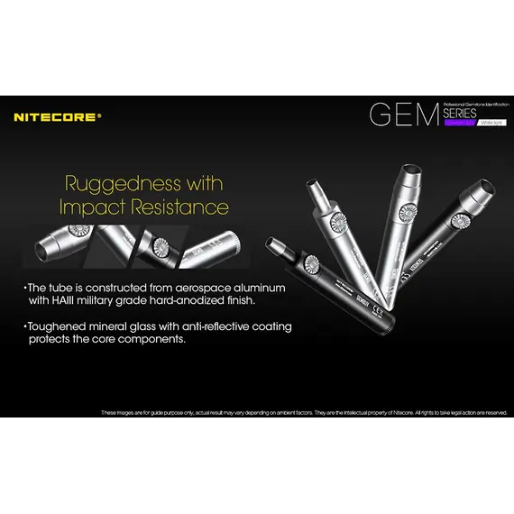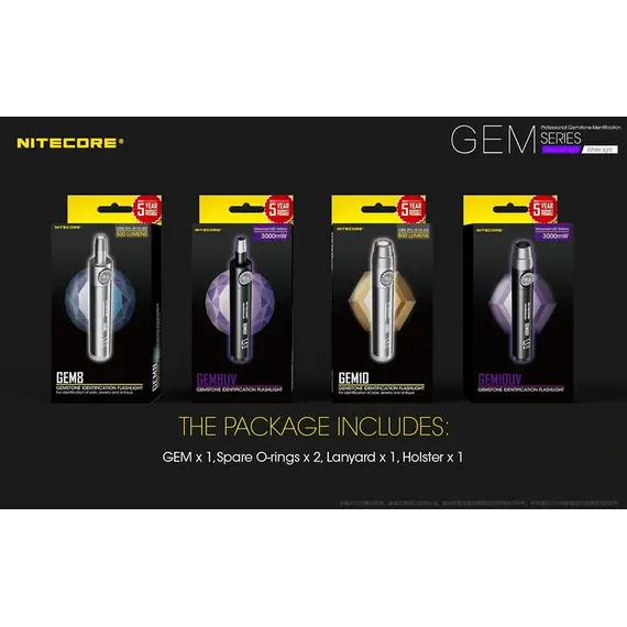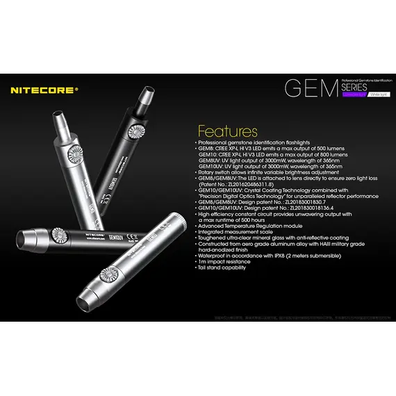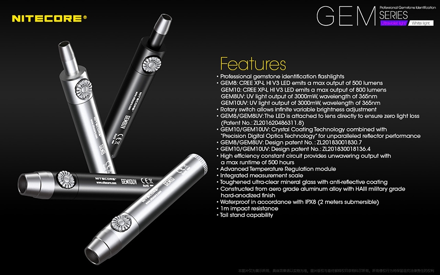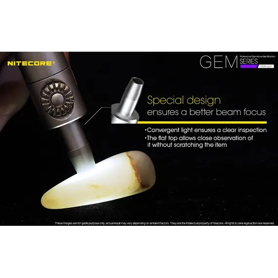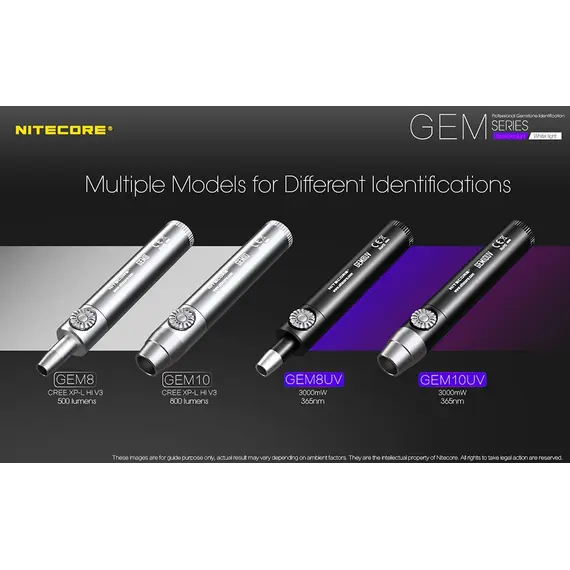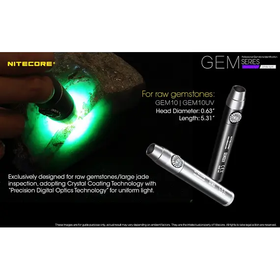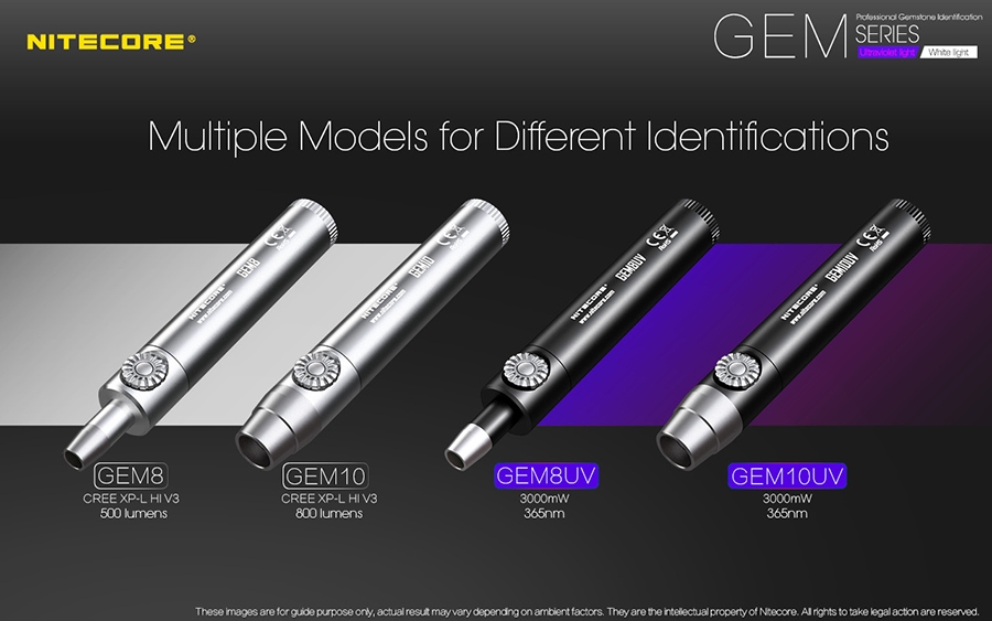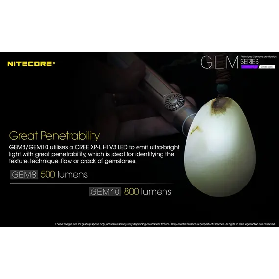 Τα GEM8 / GEM10 διαθέτουν ένα LED CREE XP-L Hi V3 που εκπέμπει εξαιρετικά φωτεινή δέσμη με εξαιρετική διεισδυτικότητα που είναι ιδανική για την αναγνώριση της υφής, της τεχνικής, ελαττωμάτων και ραγισμάτων στις πολύτιμες πέτρες.