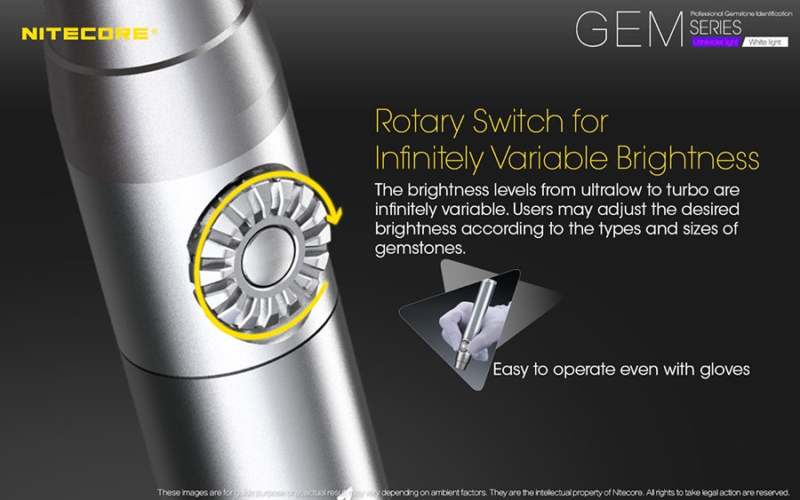 Όλα τα μοντέλα διαθέτουν περιστροφικό διακόπτη για την επιλογή της κατάλληλης φωτεινότητας. Αυτός ο τύπος διακόπτη προσφέρει απεριόριστα μεταβαλλόμενη ένταση από την πολύ χαμηλή προς την πολύ υψηλή φωτεινότητα. Ρυθμίζεται εύκολα ακόμα και μα γάντια. Η λειτουργία τους γίνεται με μία επαναφορτιζόμενη μπαταρία 18650 ή δύο μπαταρίες CR123 / RCR123. Διαθέτουν ευρεσιτεχνία για τον έξυπνο σχεδιασμό τους. Η μύτη είναι ειδικά σχεδιασμένη για να μην τραυματίζει τις πολύτιμες πέτρες κατά την διάρκεια του ελέγχου.