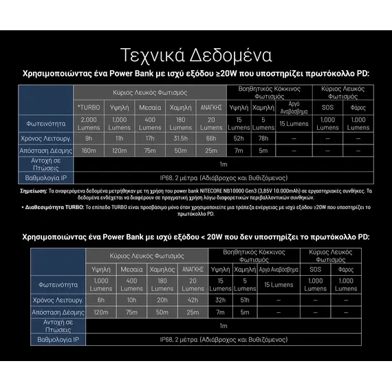 - Ειδικές λειτουργίες: Location Beacon, SOS, SLOW FLASHING