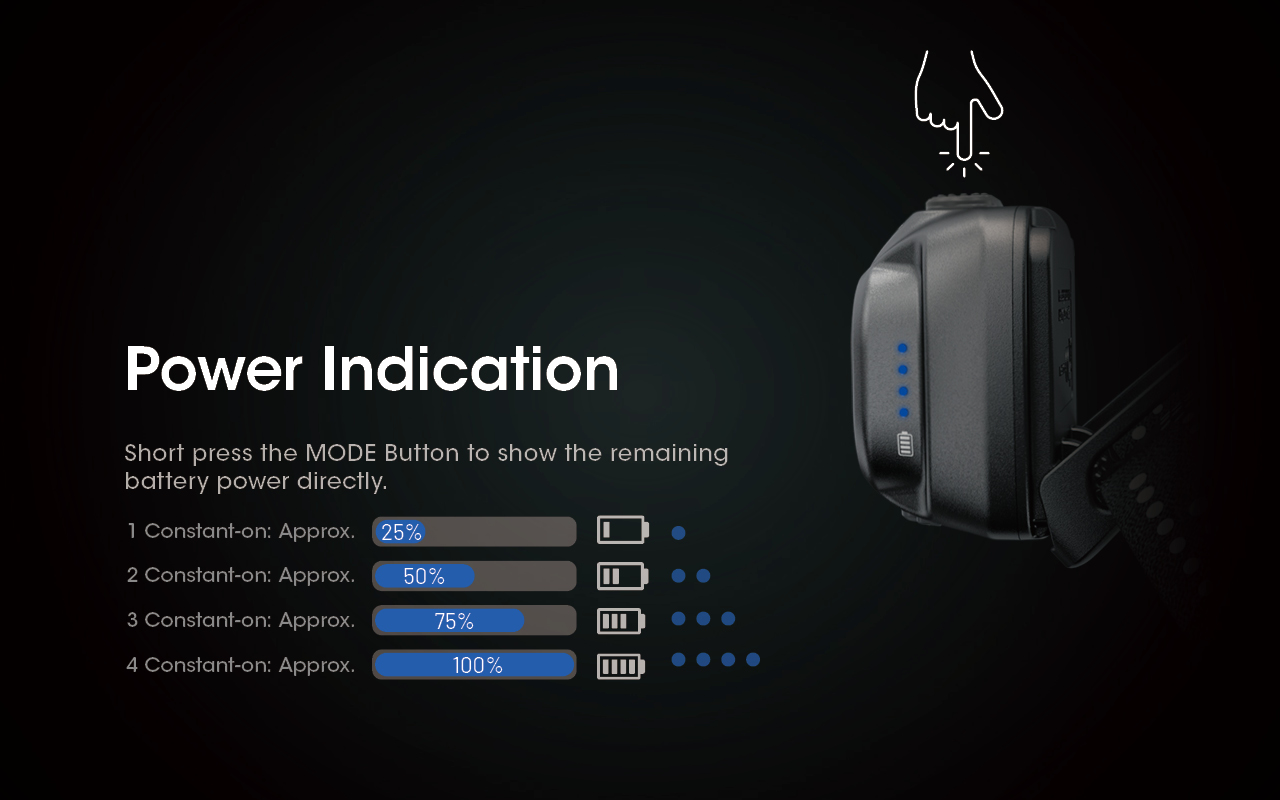 – Μία μπλε ενδεικτική λυχνία μόνιμα αναμμένη καταδεικνύει ενέργεια μπαταρίας περίπου στο 25%