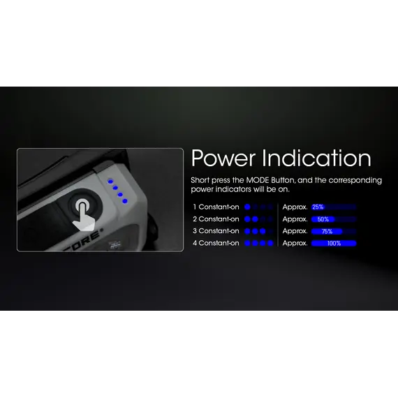 – Σχεδιασμένο με 4 ενδεικτικές λυχνίες ισχύος για να υποδεικνύει την υπολειπόμενη ισχύ της μπαταρίας