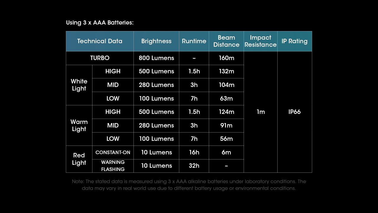 Γωνία φωτισμού : Πάνω από 100 μοίρες , Μέγιστη ισχύς: 500 Lumens , Μέγιστη απόσταση: 132 μέτρα