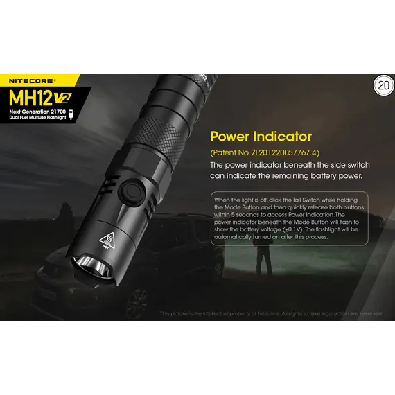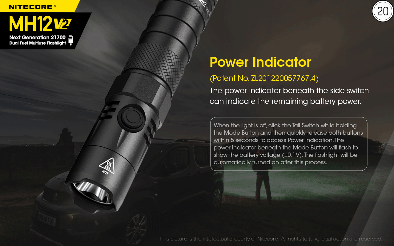- Η ενδεικτική λυχνία κάτω από τον πλάγιο διακόπτη καταδεικνύει την ενέργεια που έχει απομείνει στην μπαταρία. (Ευρεσιτεχνία No. ZL201220057767.4)