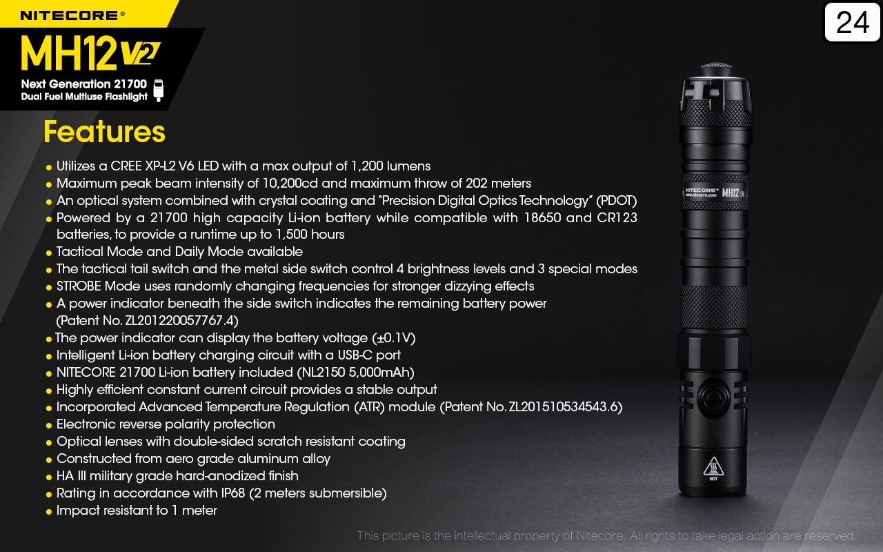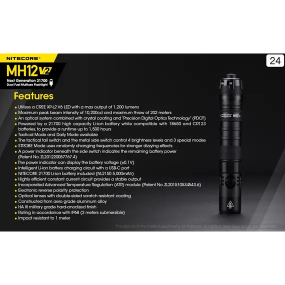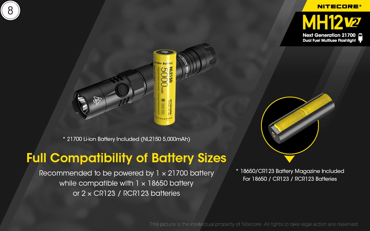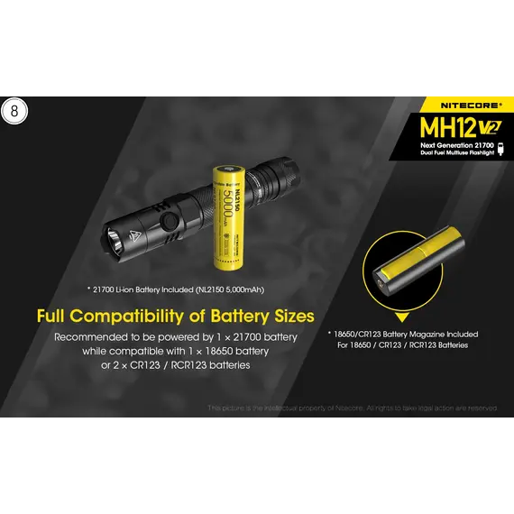 1. Εξελιγμένος φακός LED NITECORE νέας γενιάς για χρήση τόσο μπαταριών 21700 όσο και μπαταριών 18650, CR123, RCR123 ώστε ο χρήστης να μπορεί να
