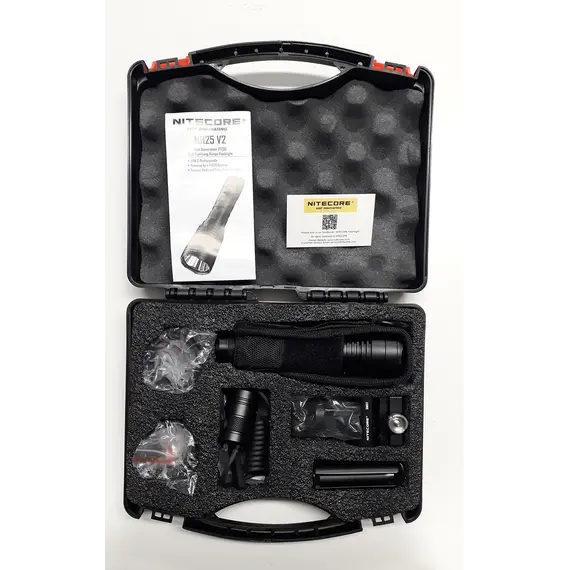 Ο καταξιωμένος φακός MH25V2 σε βαλιτσάκι μαζί με εξαρτήματα προσαρμογής.