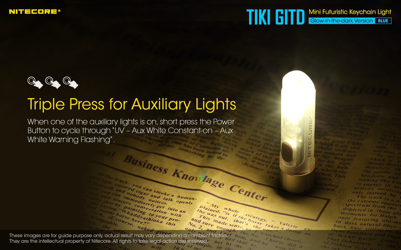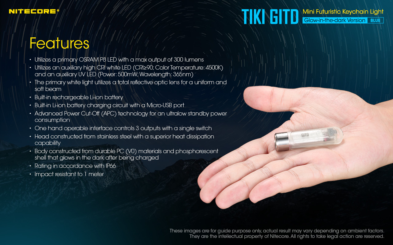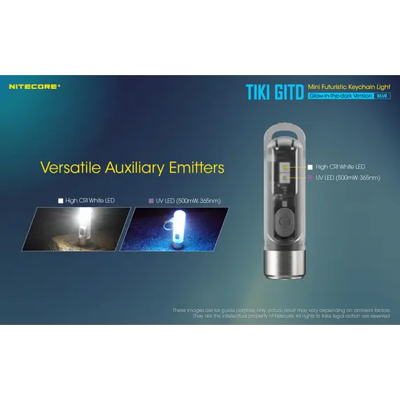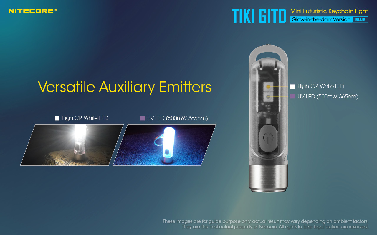 Το βοηθητικό LED υπεριώδους ακτινοβολίας (UV) του TIKI GITD έχει την ικανότητα να διεγείρει τα φωσφορίζοντα υλικά και μπορεί να χρησιμοποιηθεί ως ανιχνευτής πλαστών χαρτονομισμάτων και επισήμων εγγράφων , ως ελεγκτής φωσφοριζόντων χημικών, ενεργοποιητής φωσφοριζόντων αντικειμένων ή μπορεί να έλξει έντομα.