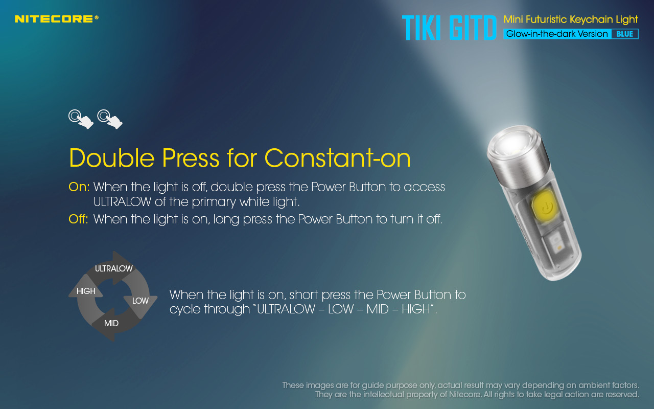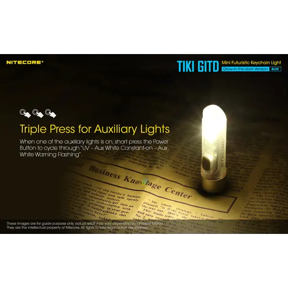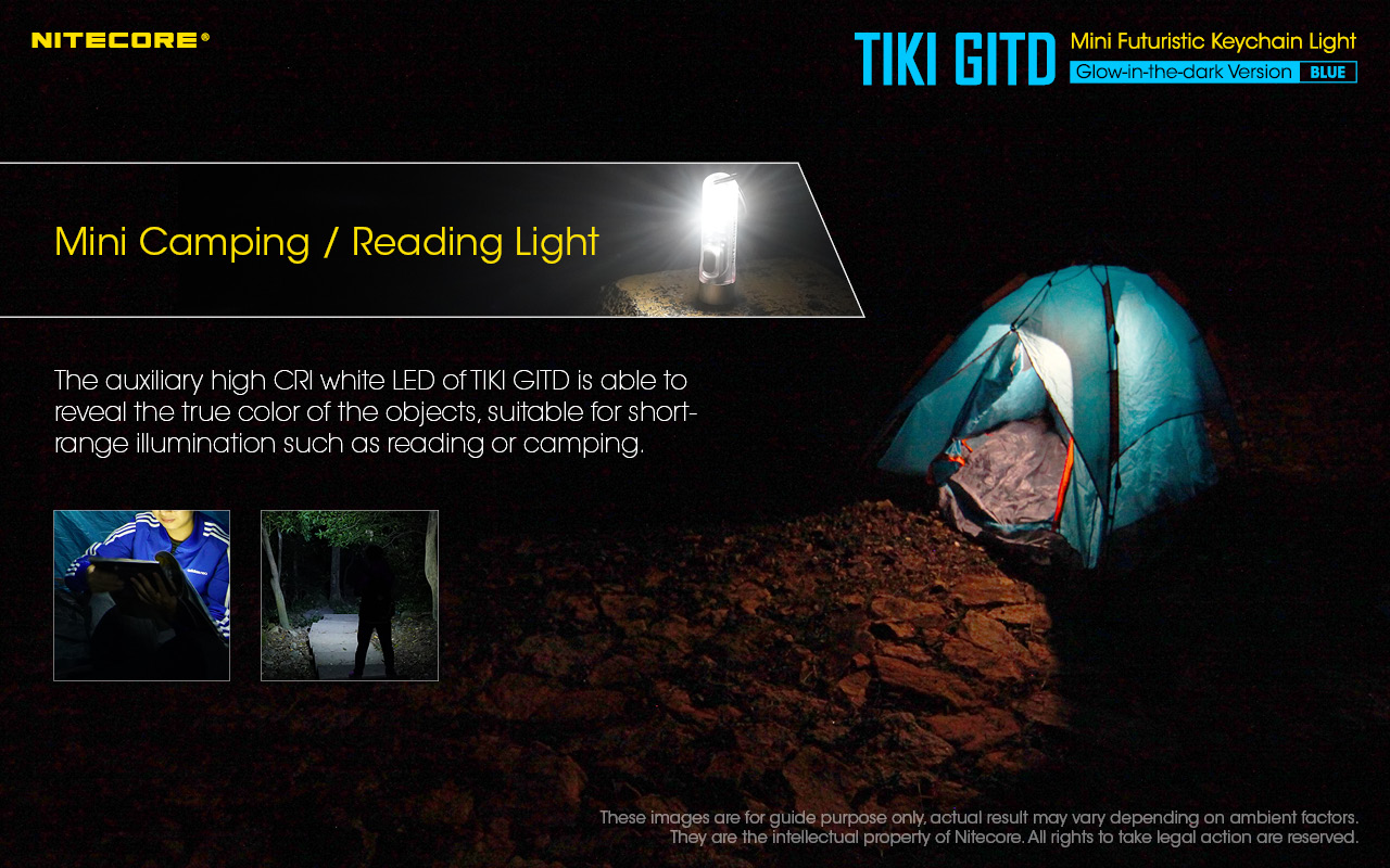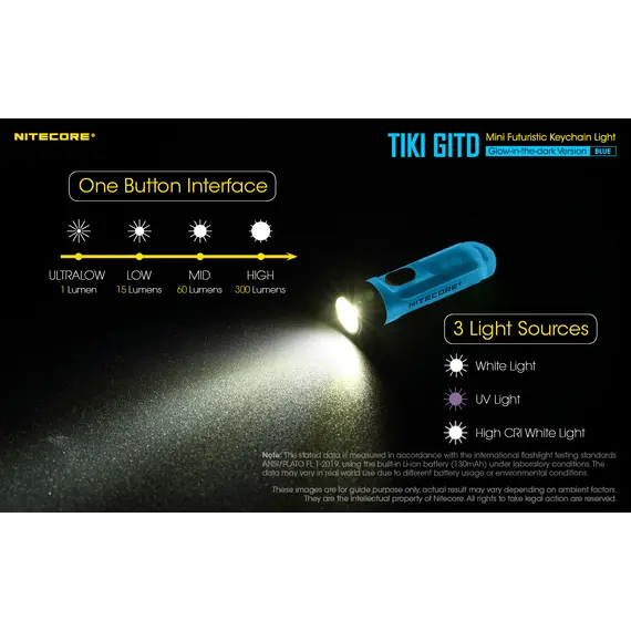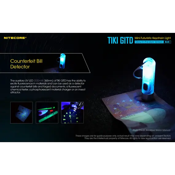 Το βοηθητικό LED υπεριώδους ακτινοβολίας (UV) του TIKI GITD έχει την ικανότητα να διεγείρει τα φωσφορίζοντα υλικά και μπορεί να χρησιμοποιηθεί ως ανιχνευτής πλαστών χαρτονομισμάτων και επισήμων εγγράφων , ως ελεγκτής φωσφοριζόντων χημικών, ενεργοποιητής φωσφοριζόντων αντικειμένων ή μπορεί να έλξει έντομα.