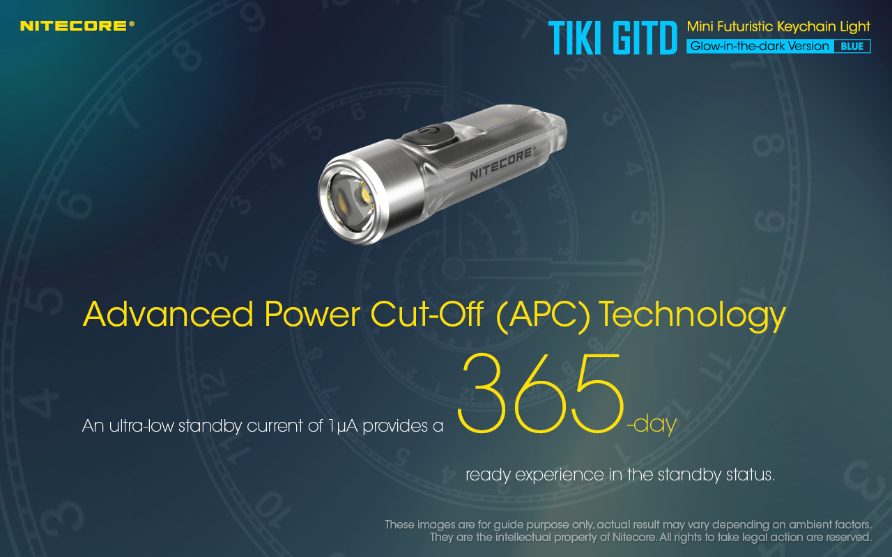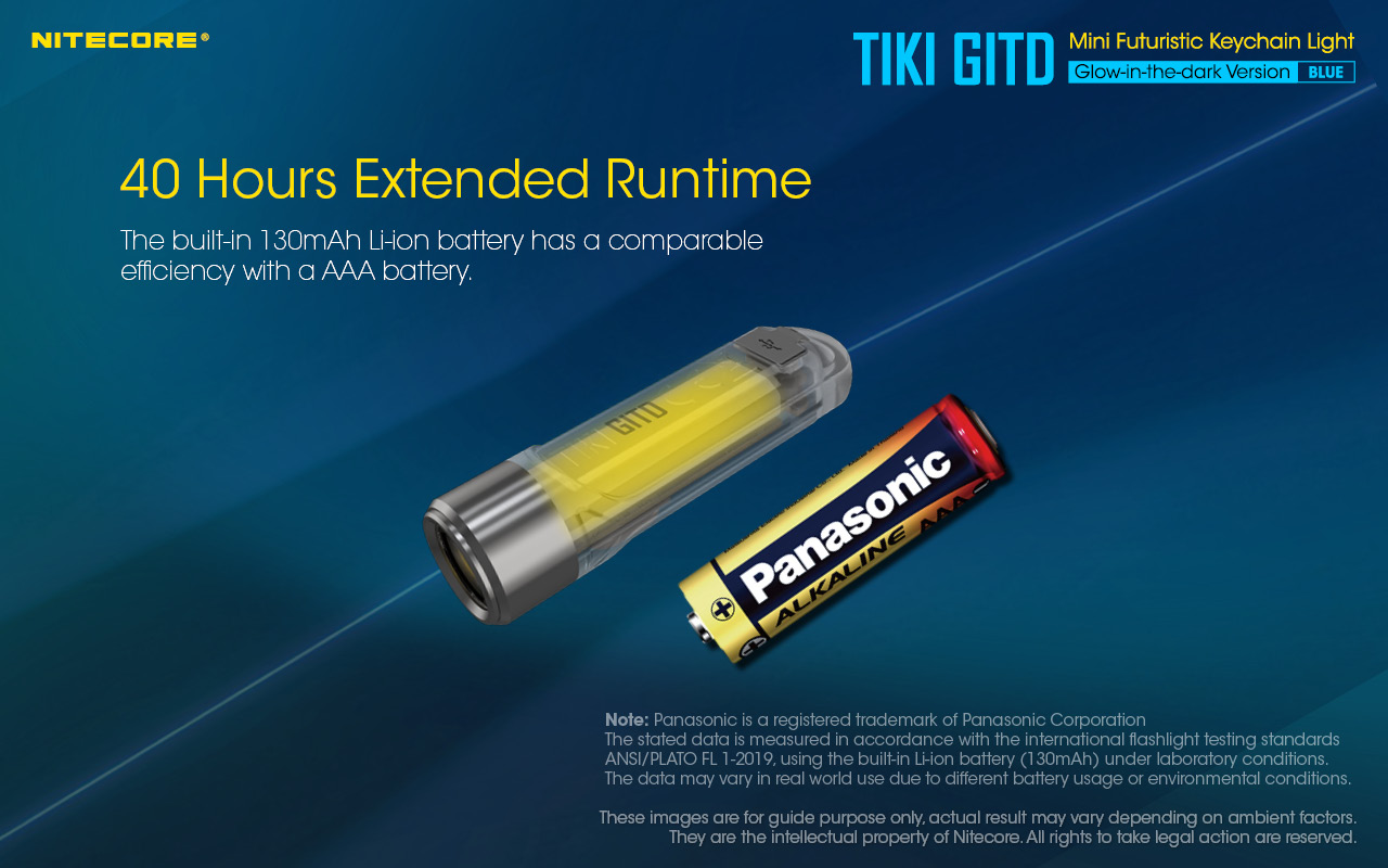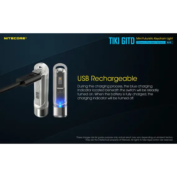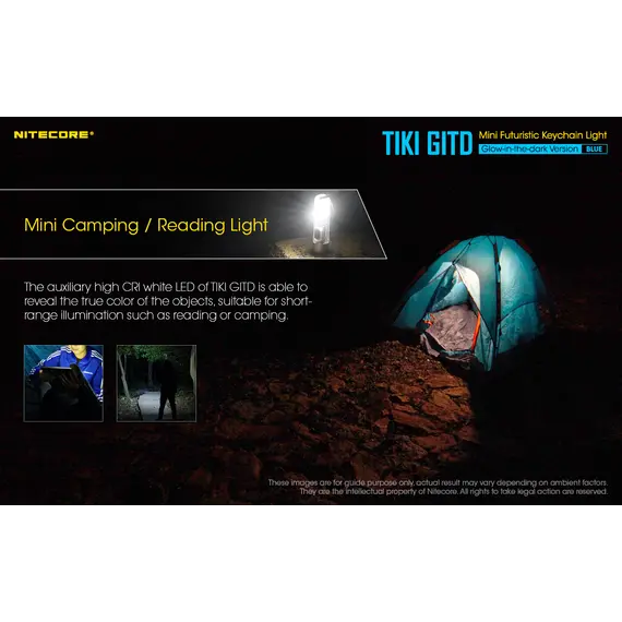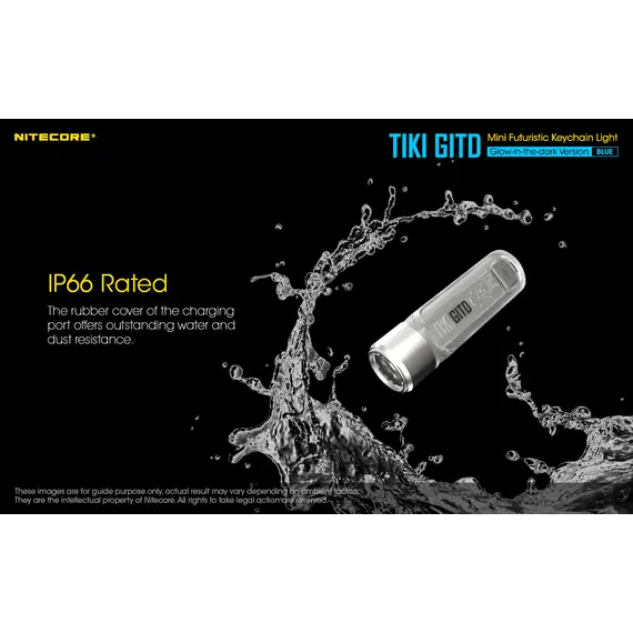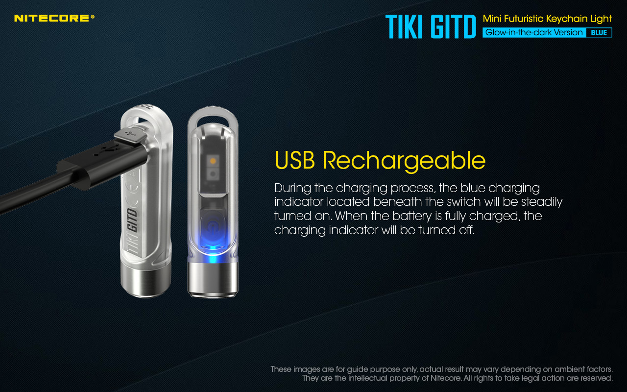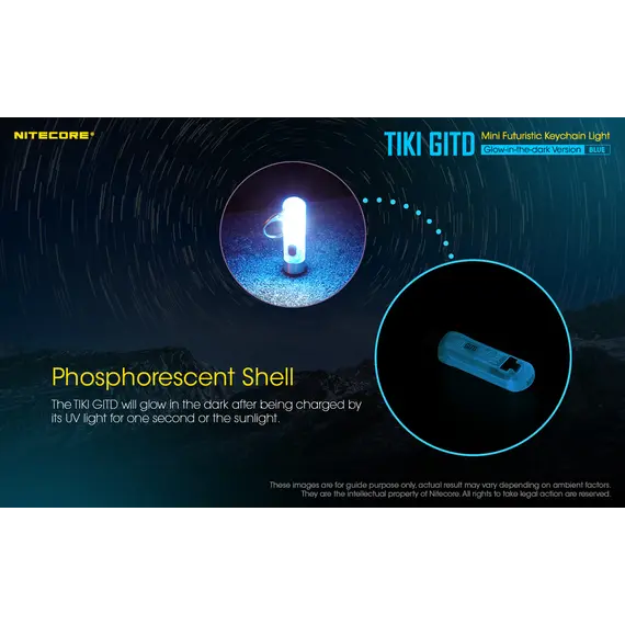 Το TIKI GITD θα φωσφορίζει στο σκοτάδι αν φορτιστεί με το δικό του υπεριώδες φως για ένα λεπτό ή από τον ήλιο.