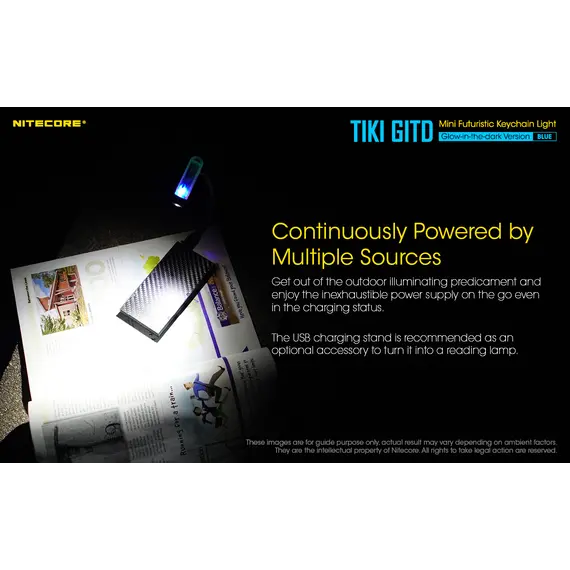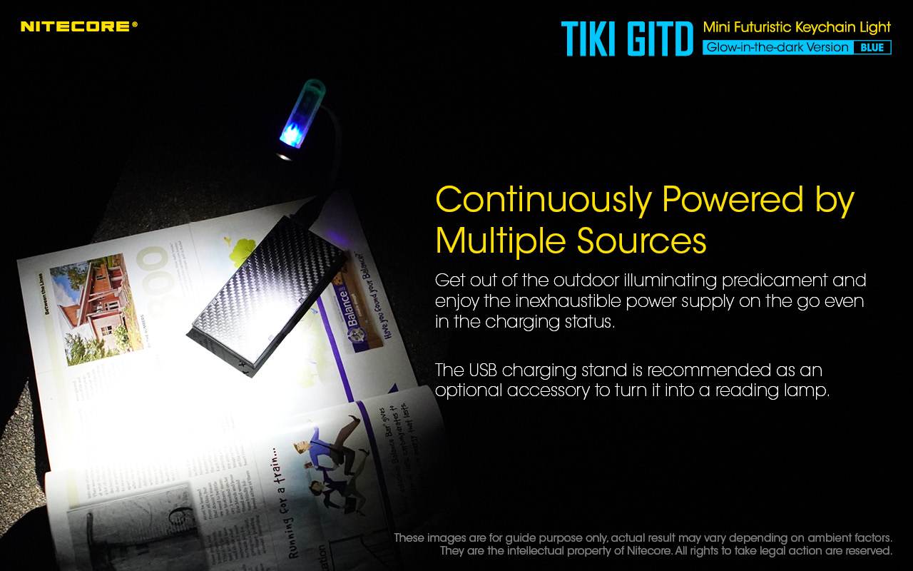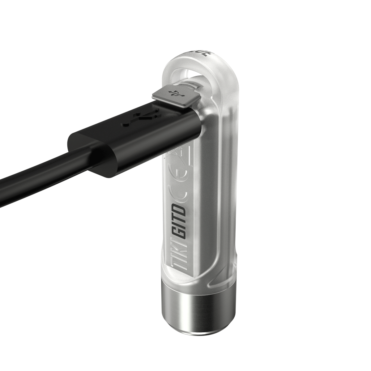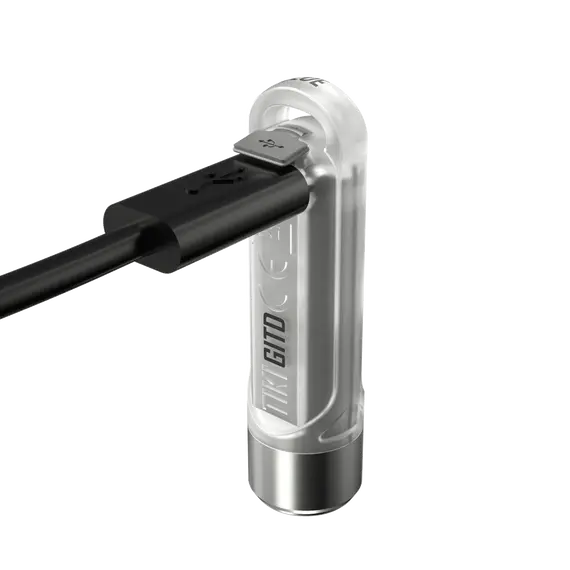 Το ειδικό σκληρό καλώδιο φόρτισης της NITECORE (προαιρετικό αξεσουάρ) που λειτουργεί και ως στήριγμα, προτείνεται για την μετατροπή του TIKI GITD σε σταθερό φωτιστικό για το διάβασμα.