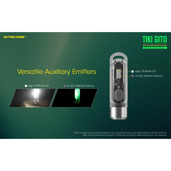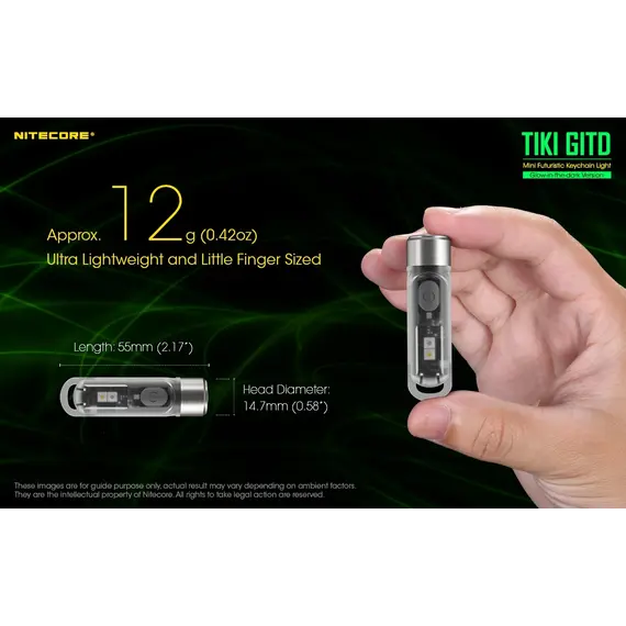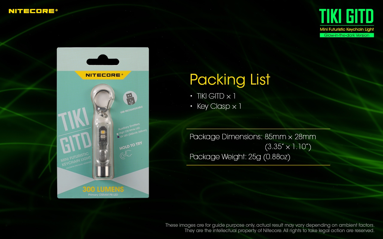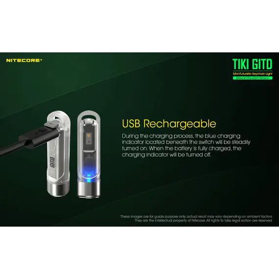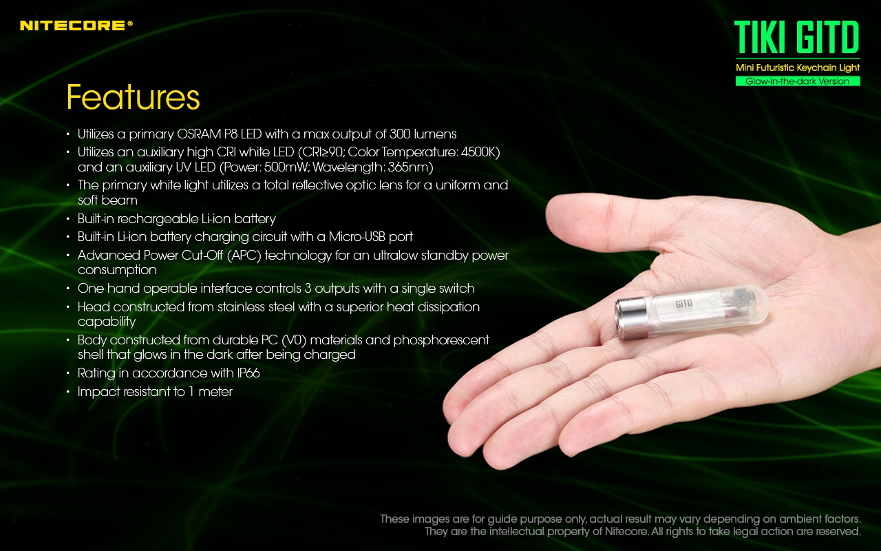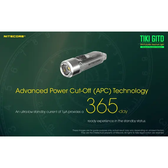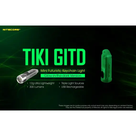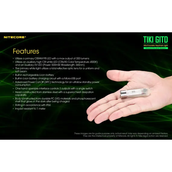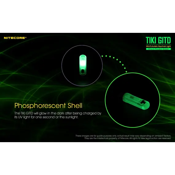 Ο TIKI GITD θα φωσφορίζει στο σκοτάδι αφού φωτιστεί για ένα δευτερόλεπτο από Υπεριώδες ακτινοβολία (UV) ή από το Ηλιακό φως.
