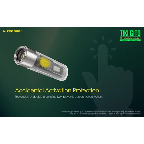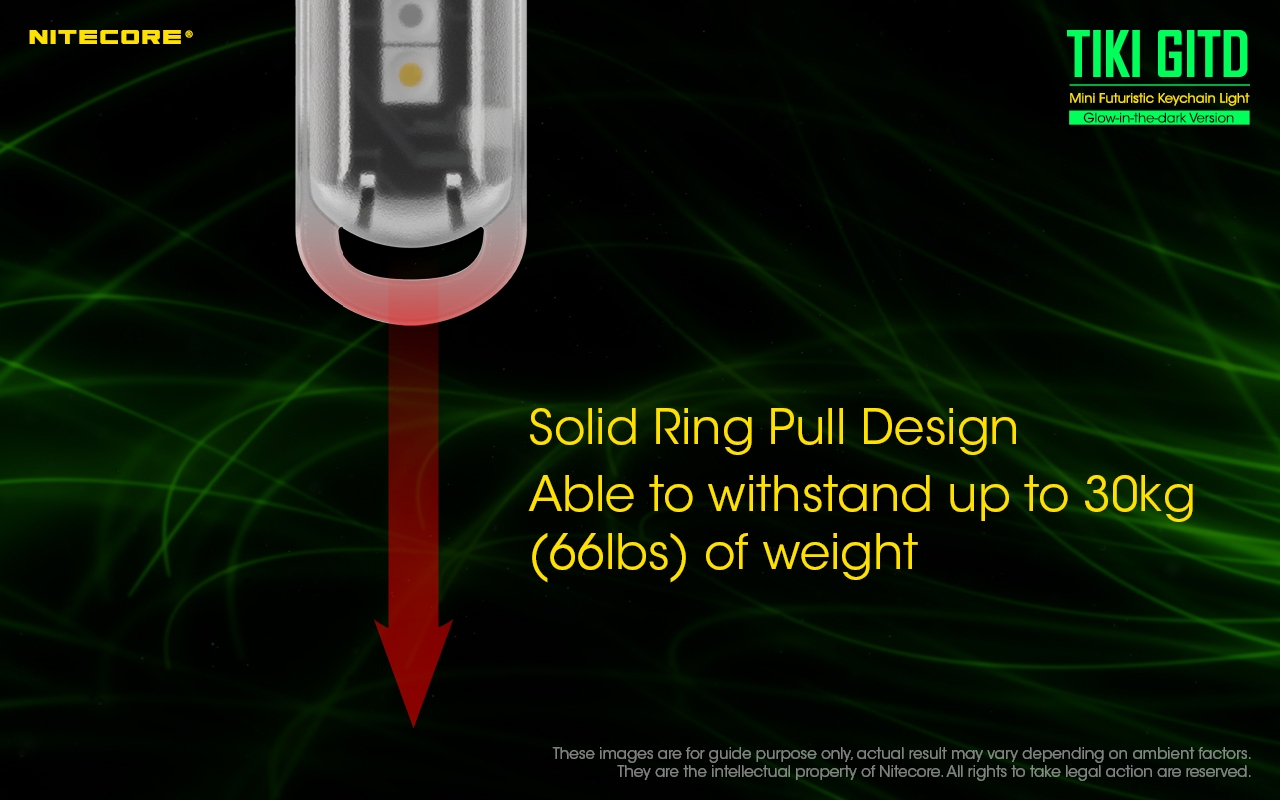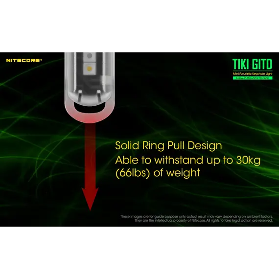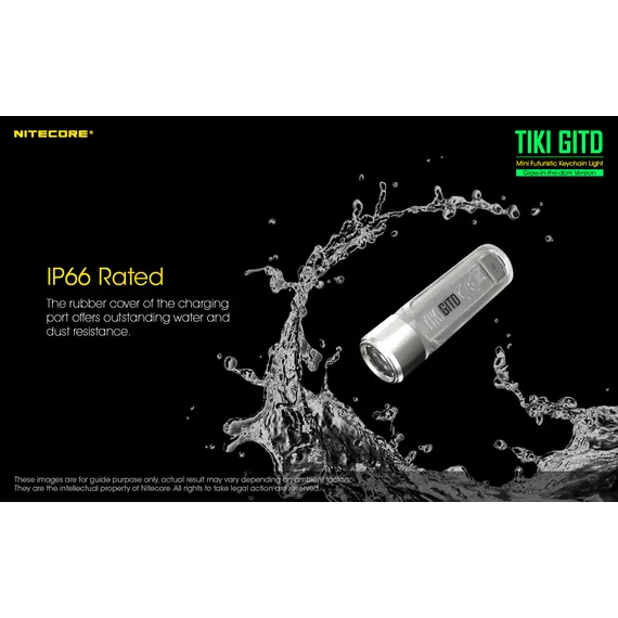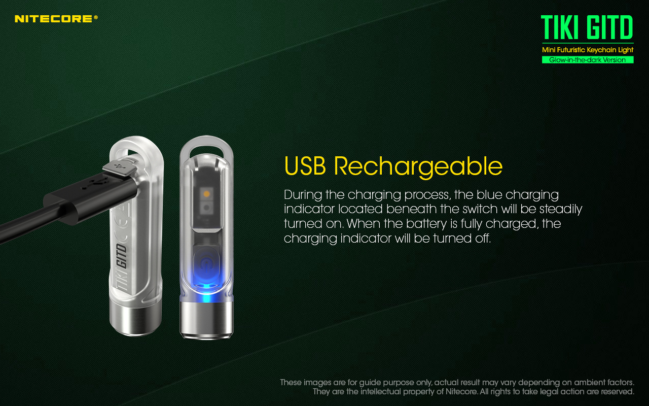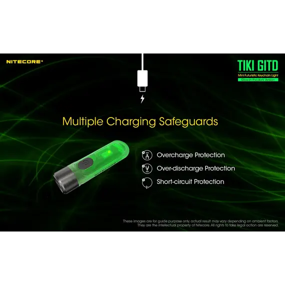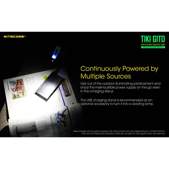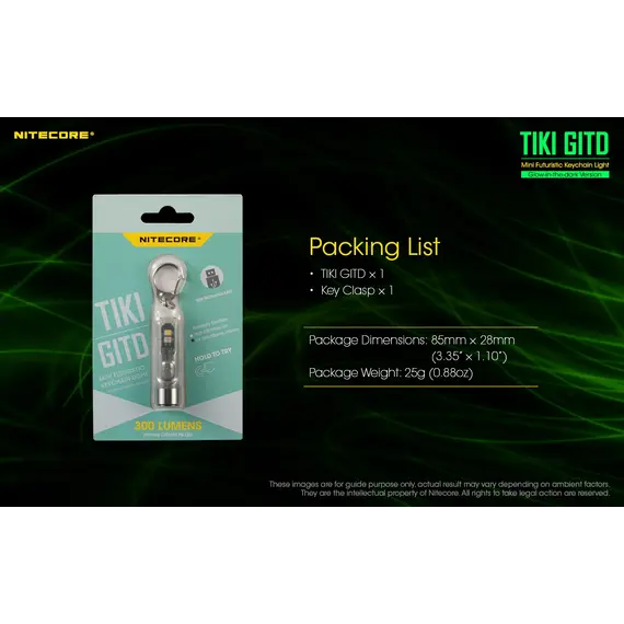 Ο TIKI GITD θα φωσφορίζει στο σκοτάδι αφού φωτιστεί για ένα δευτερόλεπτο από Υπεριώδες ακτινοβολία (UV) ή από το Ηλιακό φως.