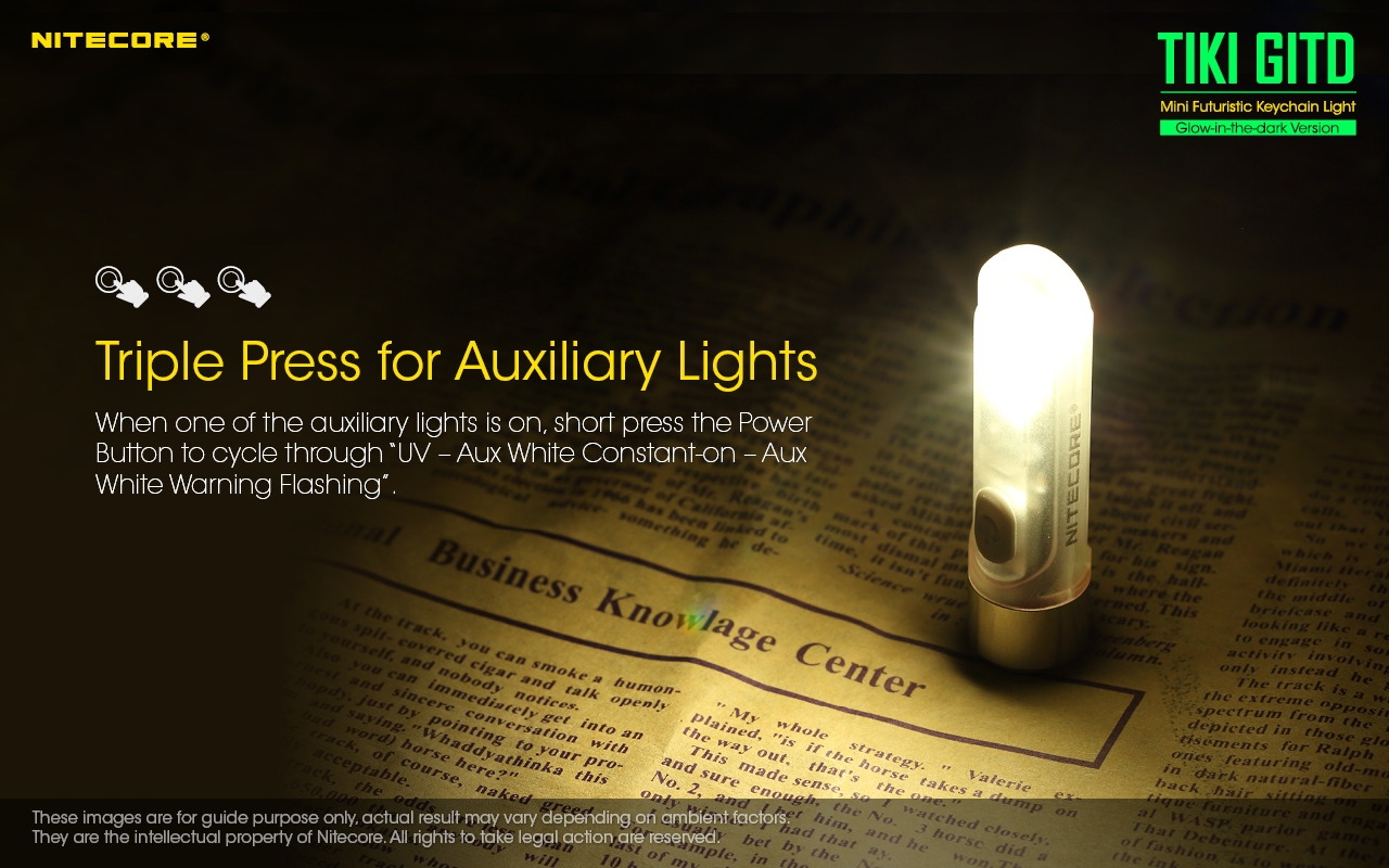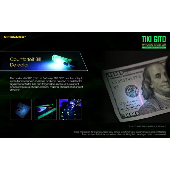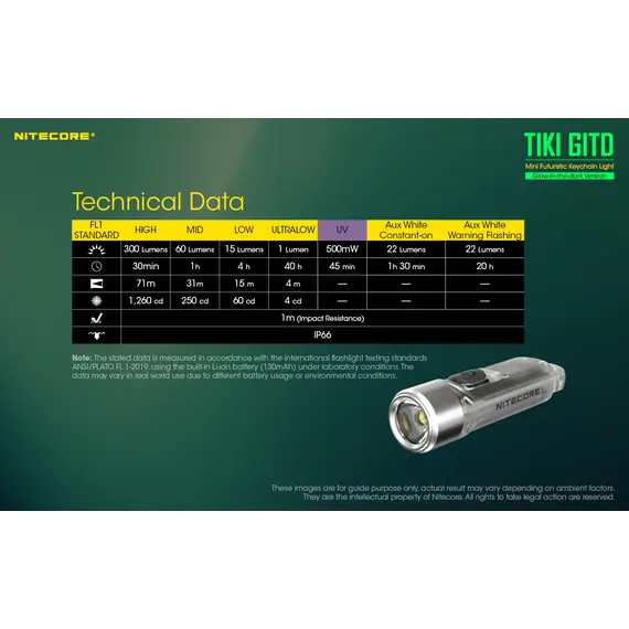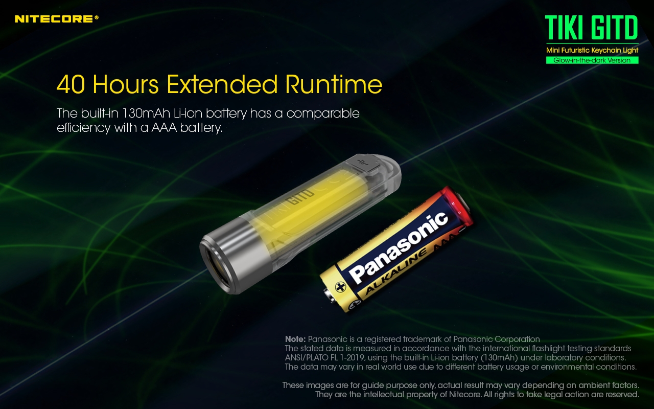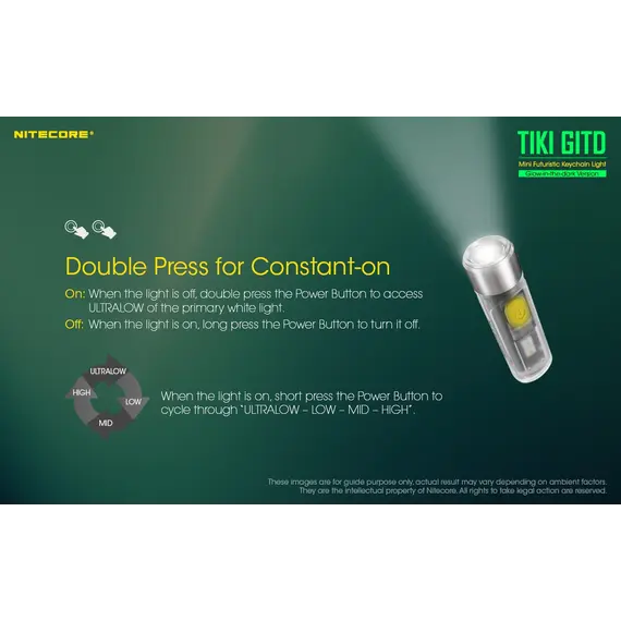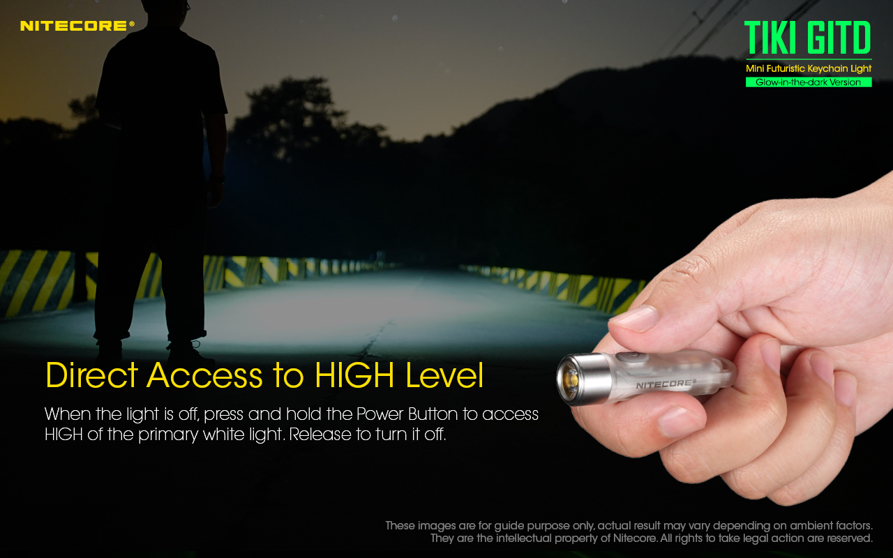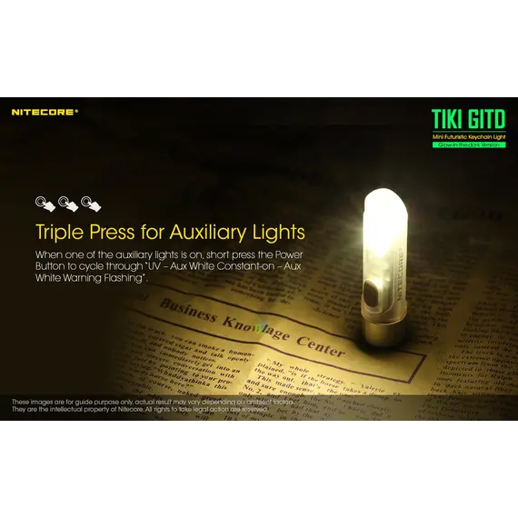 Ο TIKI GITD θα φωσφορίζει στο σκοτάδι αφού φωτιστεί για ένα δευτερόλεπτο από Υπεριώδες ακτινοβολία (UV) ή από το Ηλιακό φως.
