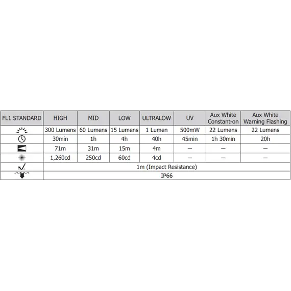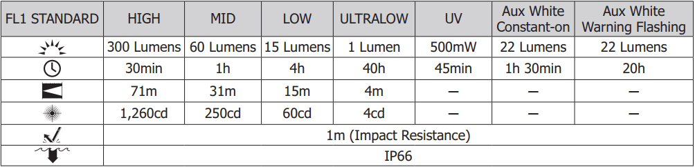 Πολύ Χαμηλή ένταση 1lumen > Xαμηλή Ένταση 15Lumens > Μεσαία Ένταση 60Lumens > Υψηλή ένταση 300Lumens