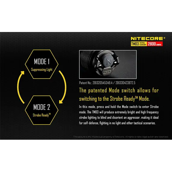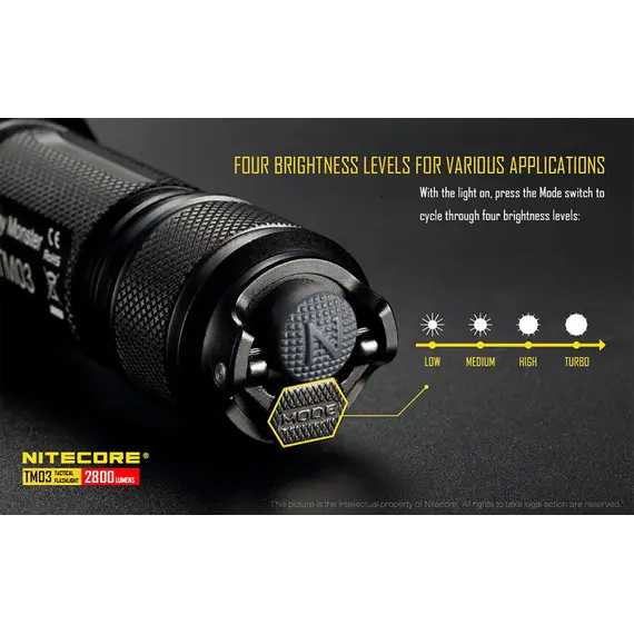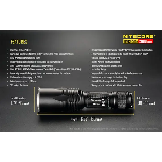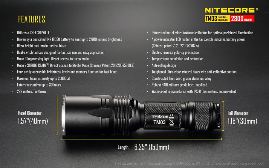 Καινούριος επιχειρησιακός φακός της οικογένειας Tiny Monster. Εξαιρετικά υψηλή απόδοση που φθάνει τα 2800 Lumens με την χρήση μίας, ειδικά κατασκευασμένης για αυτόν, επαναφορτιζόμενης μπαταρίας IMR18650 (Συμπεριλαμβάνεται). Τέσσερα επίπεδα φωτεινότητας και Άμεσο Strobe με ην χρήση του ειδικού κουμπιού “STROBE READY®” του διπλού διακόπτη ουράς. Επίσης πολύ χρήσιμη είναι η λειτουργία του Άμεσου Μέγιστου Φωτισμού. Ο καθρέπτης του είναι ειδικά σχεδιασμένος, εξαιρετικά βαθύς και με ζαγρέ επιφάνεια ώστε να διανέμει τον ισχυρό φωτισμό ομοιόμορφα.