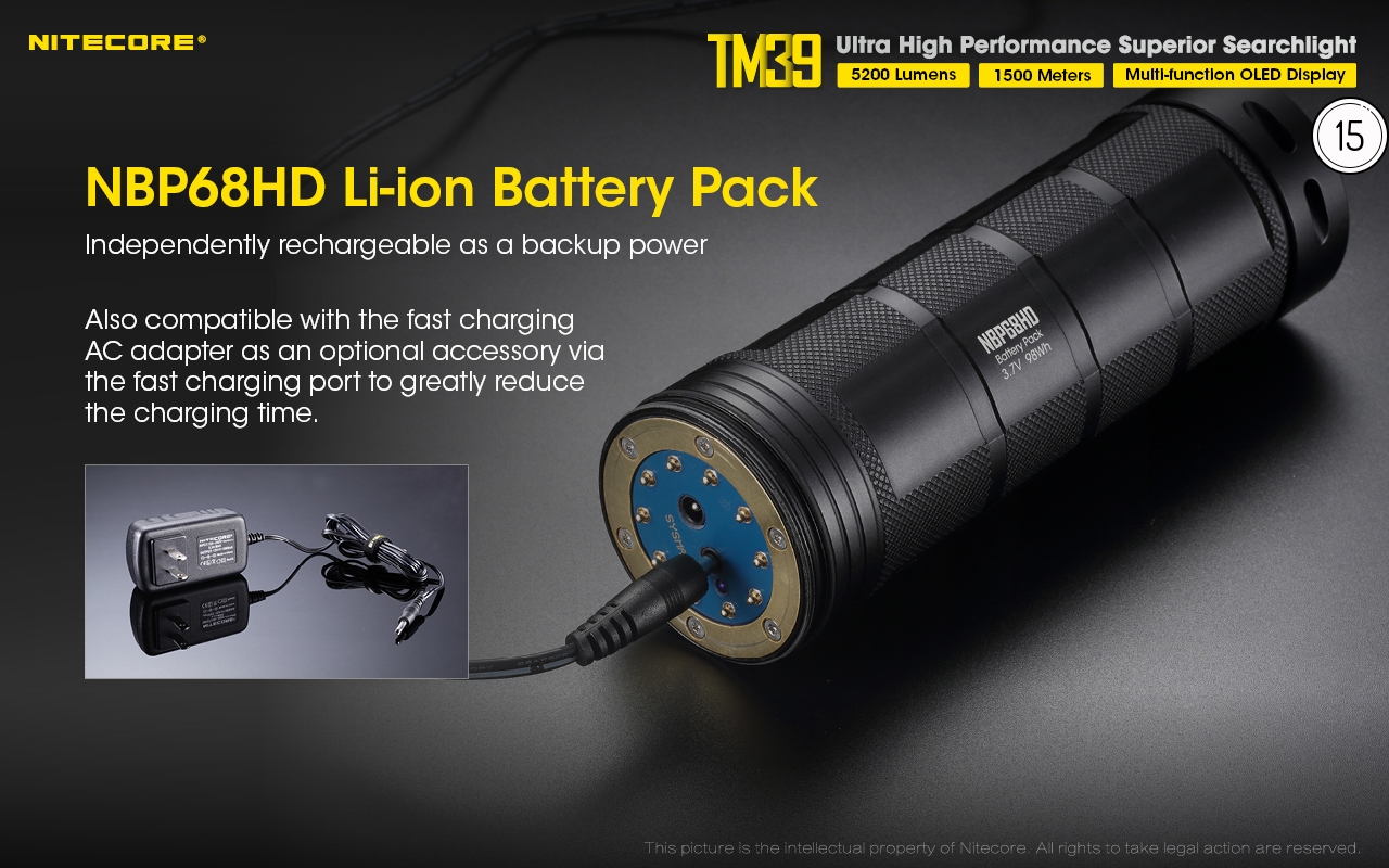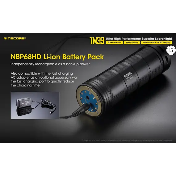 15. Το πακέτο μπαταρία NBP68HD μπορεί να φορτιστεί ανεξάρτητα από τον φακό, καθώς επίσης είναι συμβατό και με ταχυφορτιστή (ως επιπλέον αξεσουάρ)
