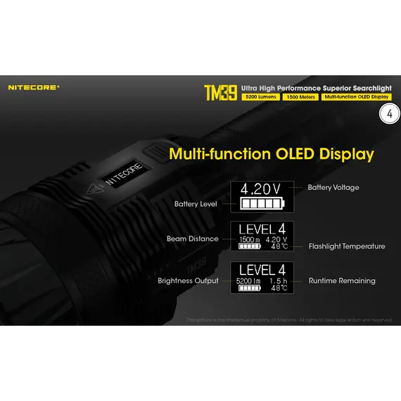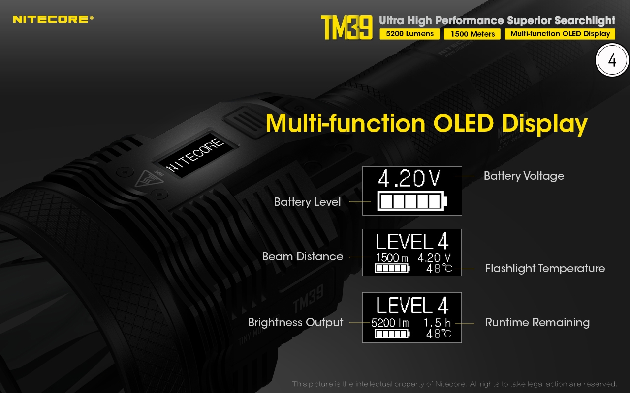 04. Η πολυχρηστική οθόνη OLED αναφέρει την τάση και το επίπεδο της μπαταρίας, την απόσταση δέσμης και την θερμοκρασία του φακού, το επίπεδο έντασης και την διάρκεια
