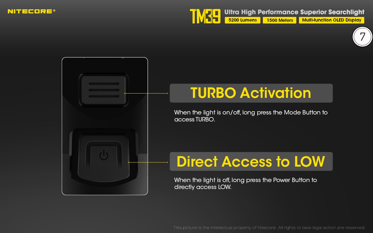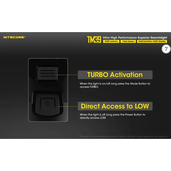 07. Για την άμεση ενεργοποίηση του TURBO φωτισμού, πατήστε παρατεταμένα τον διακόπτη λειτουργιών είτε ο φακός είναι ενεργοποιημένος είτε είναι απενεργοποιημένος.