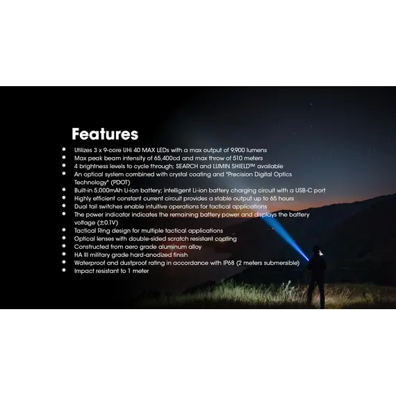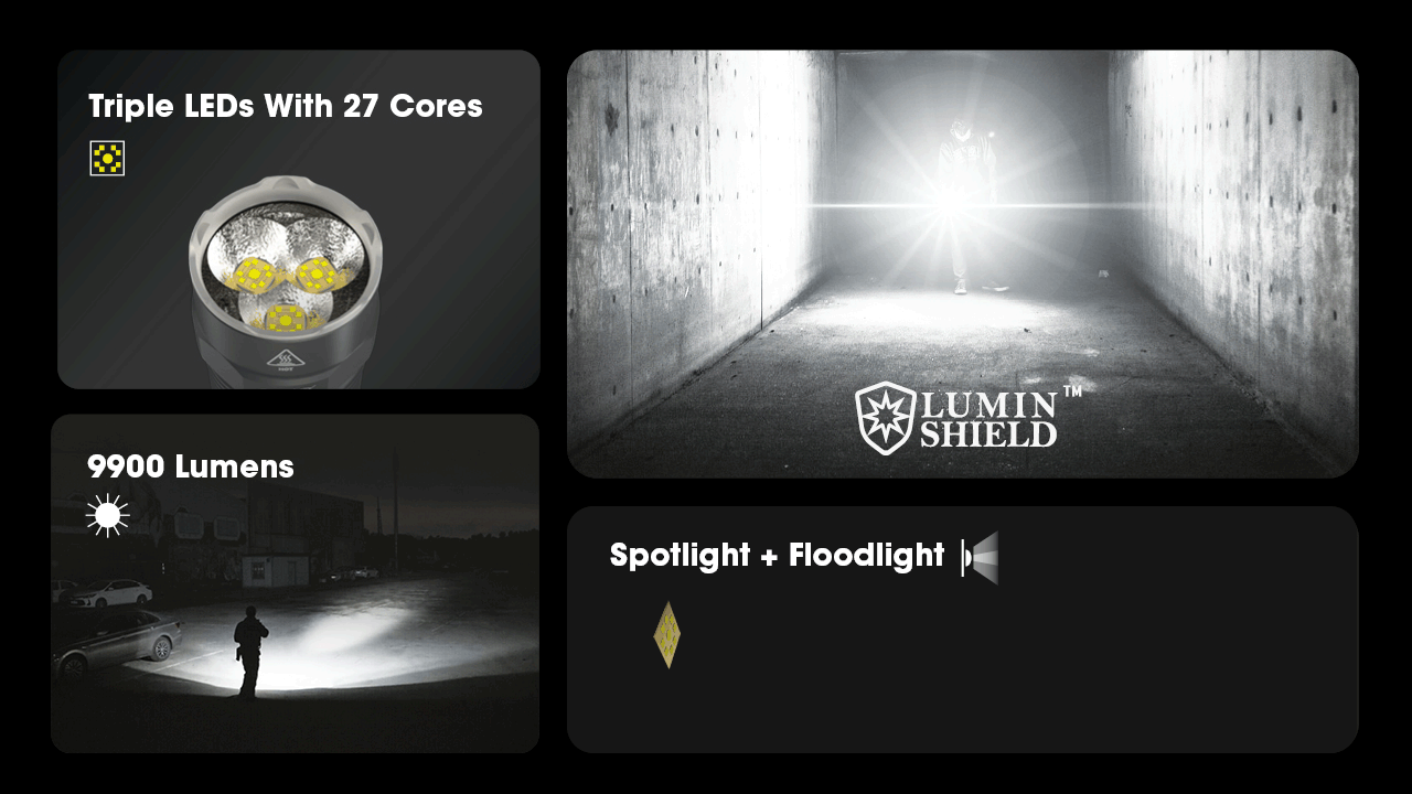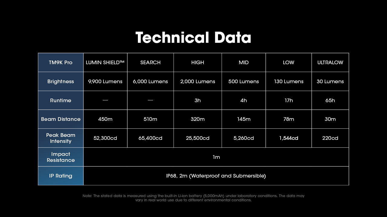 Ο TM9K Pro εισάγει μια νέα διάταξη LED με τρία καινοτόμα LED UHi 40 MAX που παρέχουν τόσο εξαιρετικά υψηλή φωτεινότητα όσο και τακτικές δυνατότητες μεγάλης εμβέλειας, ιδανικές για καθημερινή χρήση, υπαίθριες περιπέτειες ή καταστάσεις τακτικής.