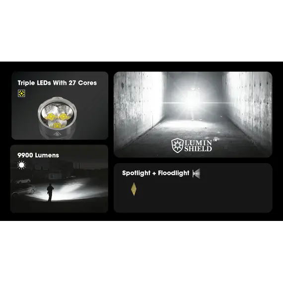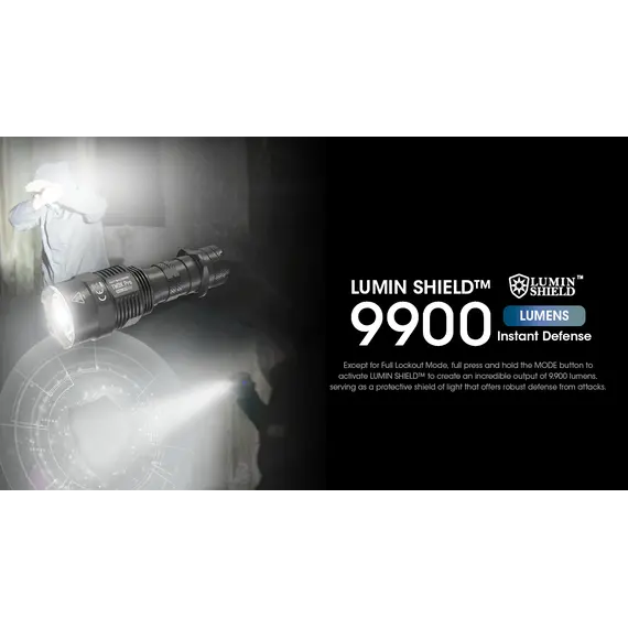 Εκτός από τη λειτουργία πλήρους κλειδώματος, πατήστε και κρατήστε πατημένο το κουμπί MODE για να ενεργοποιήσετε το LUMIN SHIELD™ για να δημιουργήσετε μια απίστευτη απόδοση 9.900 lumens, χρησιμοποιώντας την ως προστατευτική ασπίδα φωτός σε επιθέσεις.